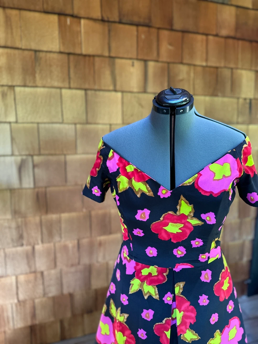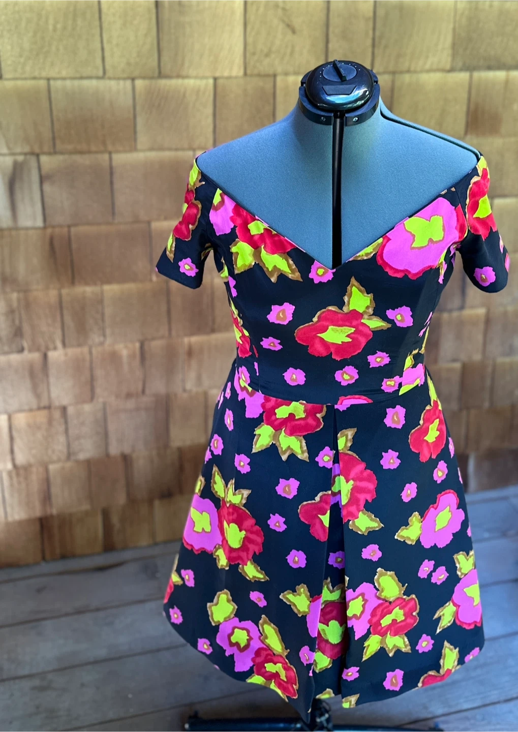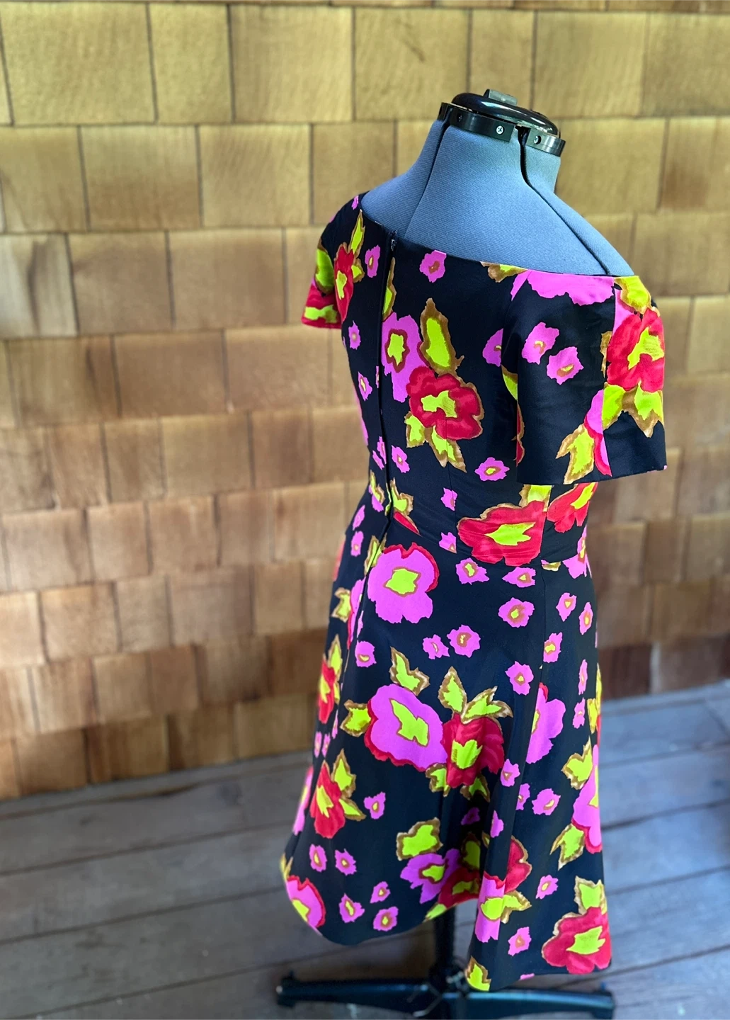 65A striking, structured dress by renowned designer Arnold Scaasi, known for dressing multiple First Ladies and creating bold, sculptural silhouettes. This piece features saturated florals in hot pink, red, and chartreuse on a deep black background. The wide V-neckline and fitted bodice lead to a skirt with soft pleating and strong movement. This is a rare find — Scaasi pieces hold value and are sought after by vintage collectors. Details • Designer: Arnold Scaasi • Size: 12 • Colour: Black with pink/red floral • Condition: Excellent • Era: 1980s–1990s • Collectible: Yes — similar dresses sell online for $400–$600 Measurements • Length: 38” • Bust: 38” • Waist: 30” • Hips: 42” • Sleeve opening: 16” Notes Beautiful structure and craftsmanship. Eye-catching floral pattern. A standout piece for collectors or anyone wanting a bold vintage moment. Price: $350
