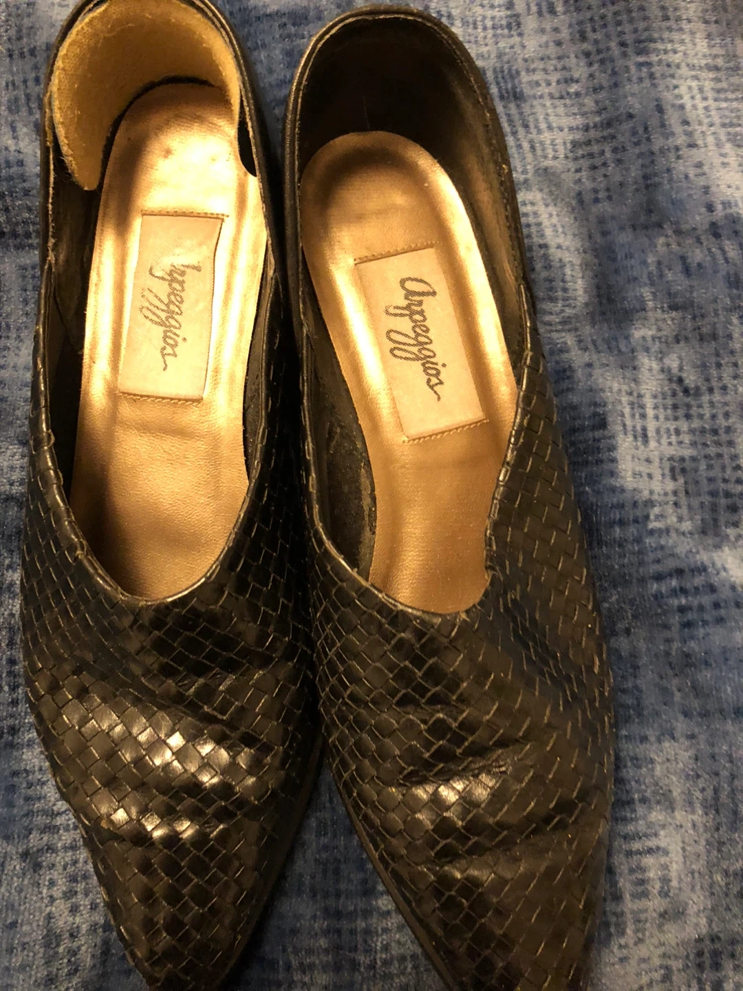 Selling a pair of Arpeggios heels in size 7.5N. They feature a unique black leather weave design. The soles show some wear, but the uppers are in good condition! Made in Brazil.