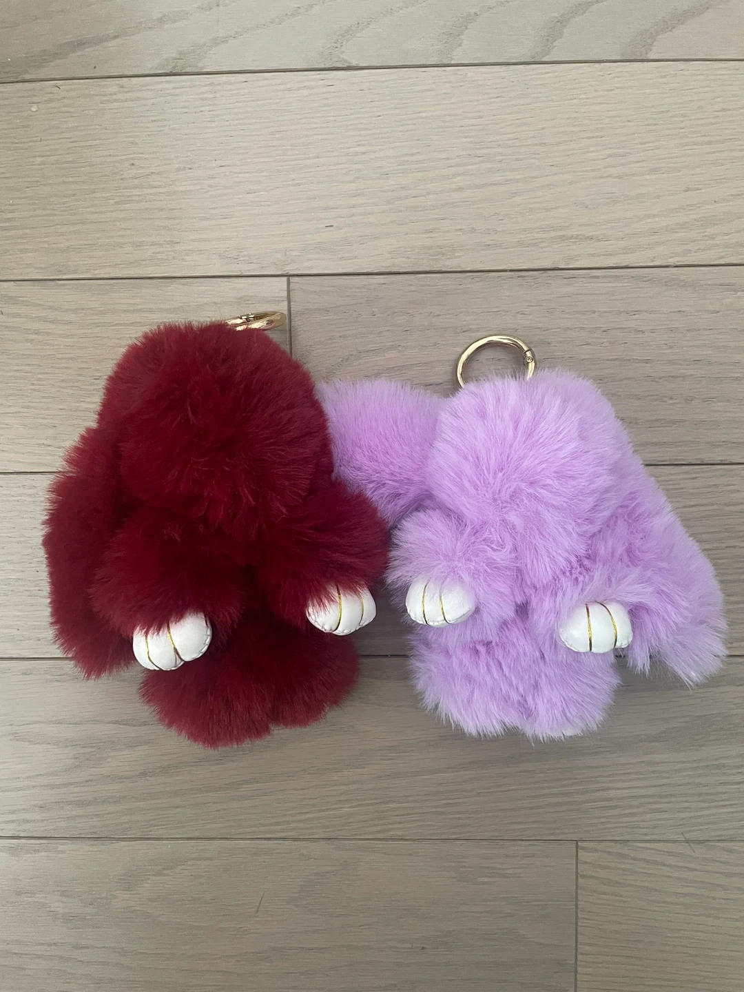 Set of two fluffy bunny key rings, one in burgundy and one in lavender. Each has a gold ring for attaching to bags or keys. These cute fluffy charms add a playful touch to your accessories!