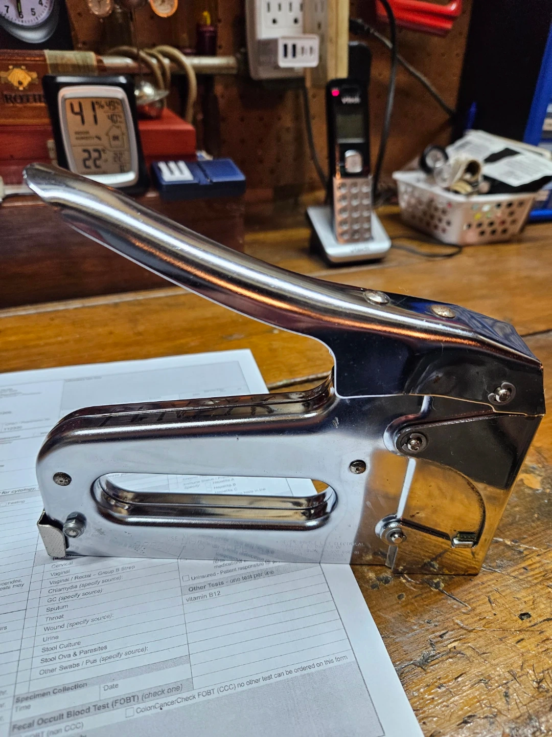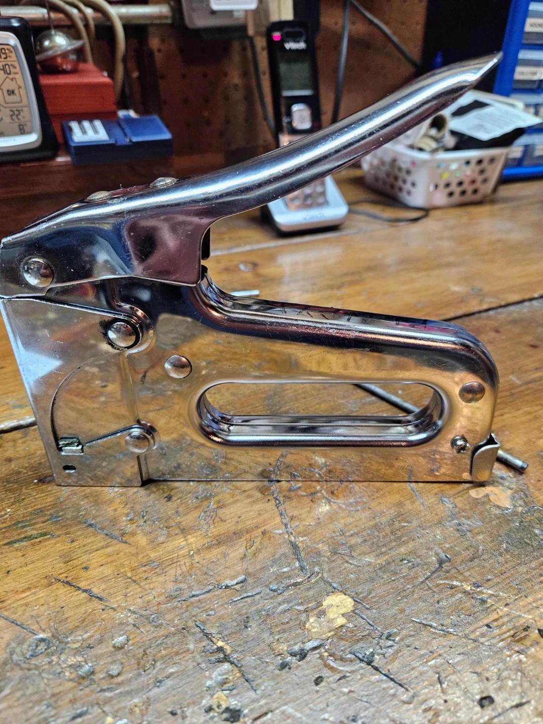 60Arrow Stapler gun with chrome finish. Takes T50 staples, great wor6ing condition. I have arthritis in my hand and can no longer operate.