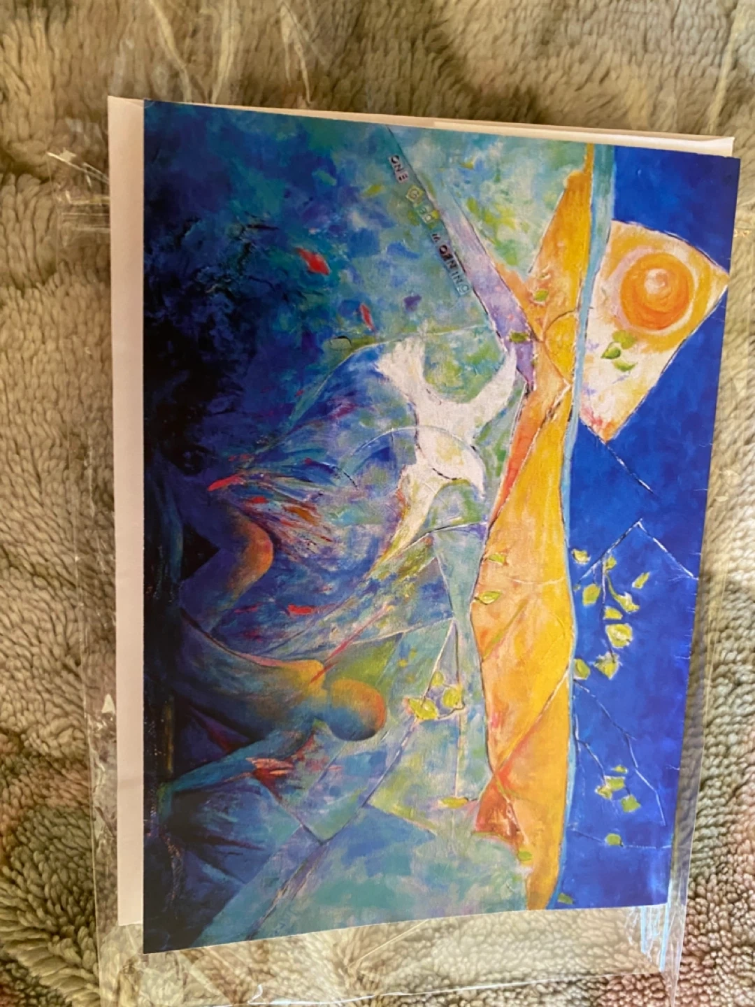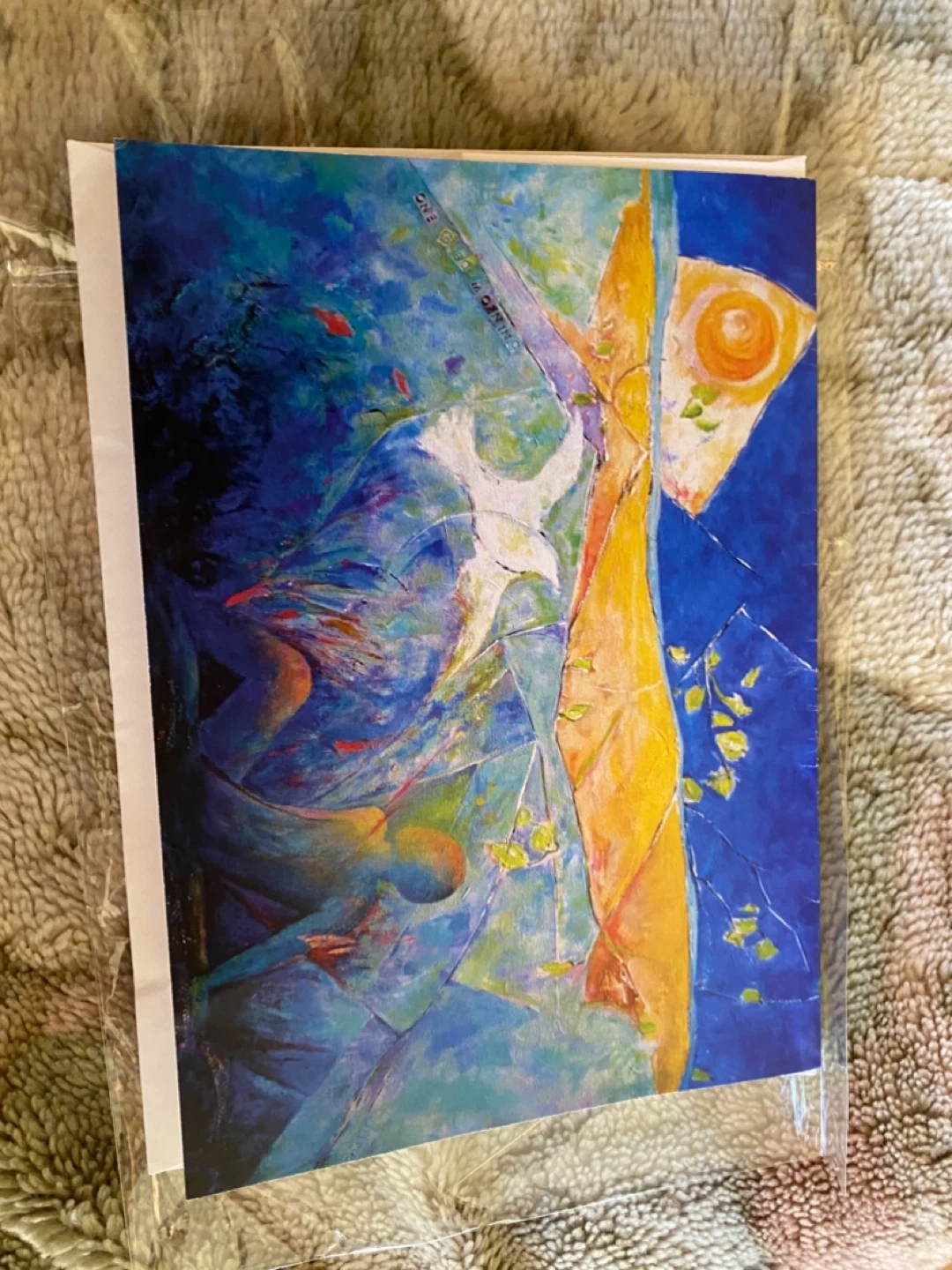A beautiful art card featuring an abstract design with blues, yellows, and greens. The title appears to be 'One Bless'd Morning Opening'. Perfect for sending a thoughtful message!