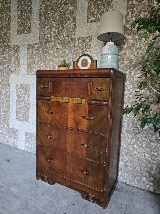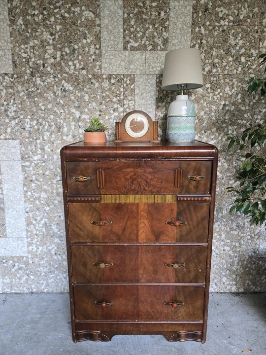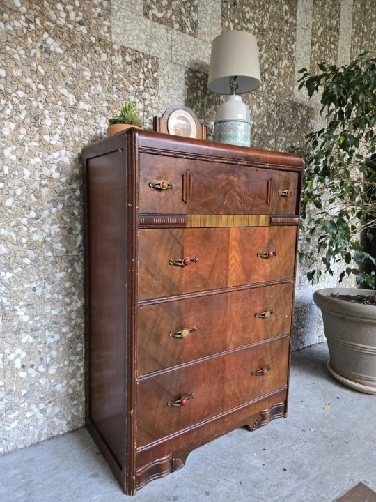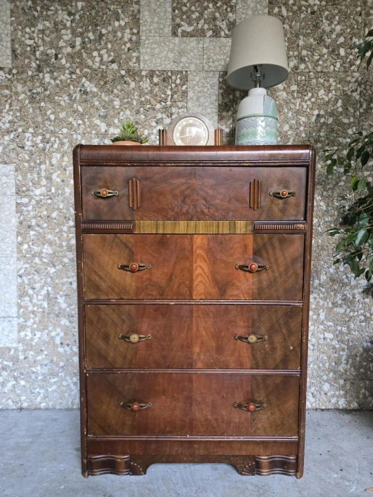 99Selling a charming vintage wooden dresser with Four drawers. It has a lovely, classic look that would fit well in many homes. There are some signs of wear consistent with its age, but it's still a very functional and stylish piece of furniture. 33w x 18d x 48h Pick up in downtown Vancouver or delivery may be arranged for a reasonable fee. Priority is given to those who are able to pick up. Follow us on Instagram to enjoy an exclusive discount on select furniture items: https://www.instagram.com/vanvaluevintage Tags: retro vintage antique burl wood rosewood walnut brass gold copper 1920s 1930s 1940s sideboard credenza buffet server Hutch cabinet tv bench hallway table console table entertainment unit living room dining room mcm mid century modern furniture retro vintage vinyl teak 1950s 1960s 1970s sixties tall boy tallboy cb2 eq3 west elm rental staging film tv Bedroom chest of drawers dresser rental