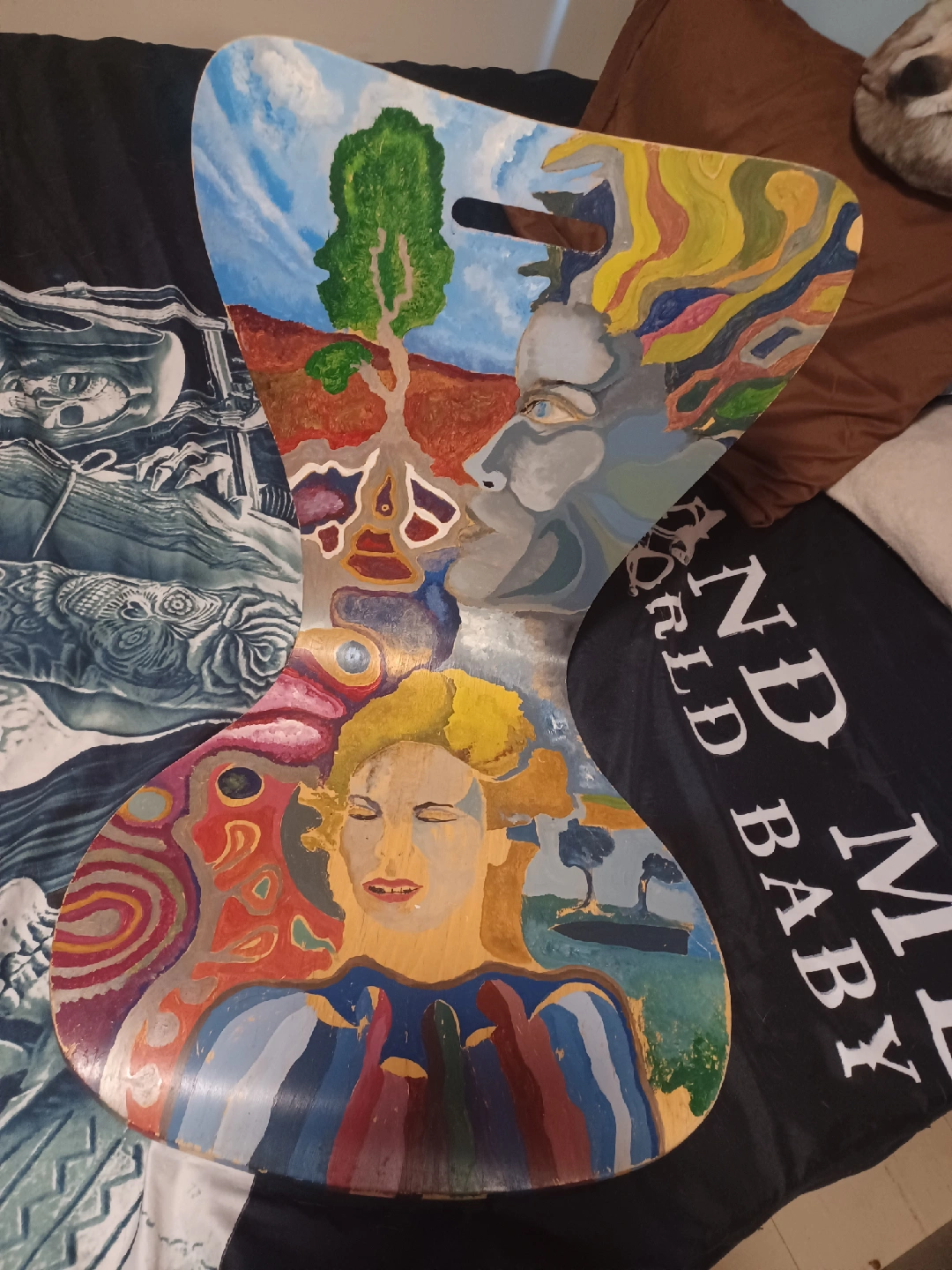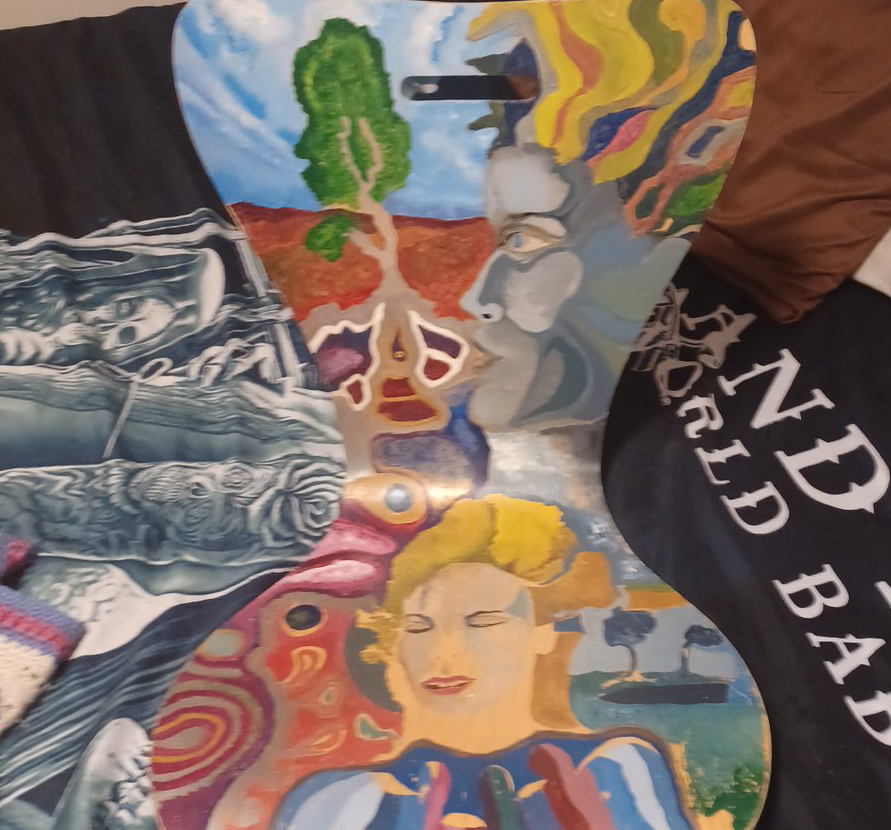 Hand painted chair missing legs. But a beautiful piece of art. I use for wall hanging.