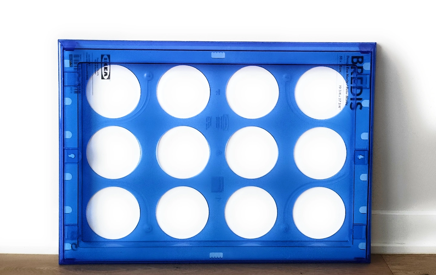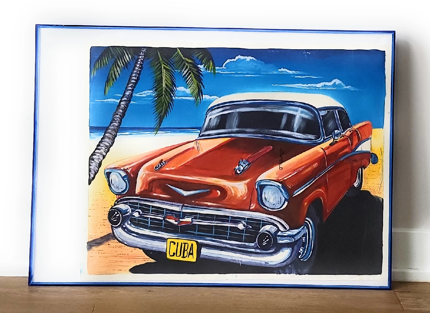 A framed painting of a classic car on a beach with a palm tree. The frame is blue. Perfect for adding a touch of vintage charm to any room