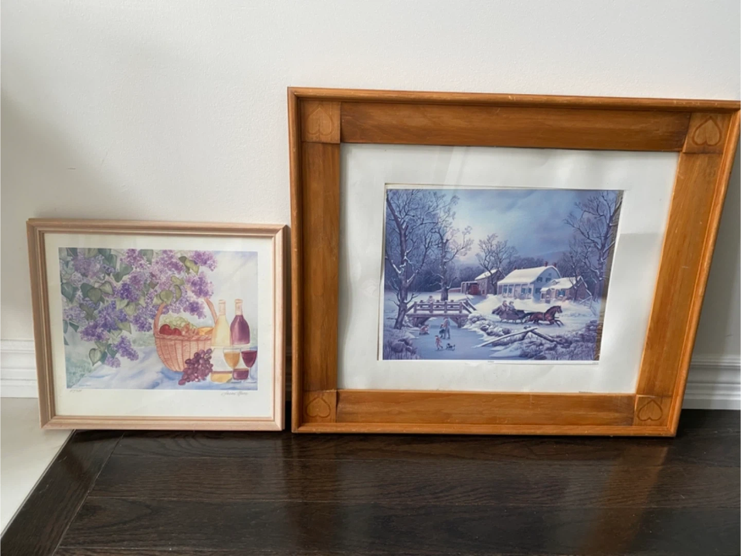 Small framed art: $5 - Solid wood frame with glass window panel. - Watercolour painting in print. - Artist signed. - 15” x 13” Large framed art: $10 - Solid wood frame with glass window panel. - Litho in USA print; Title “Winter”; Manor Art Ent. 1997 - 25” x 21” Pick up in Brampton at Mississauga Road & Williams Parkway.