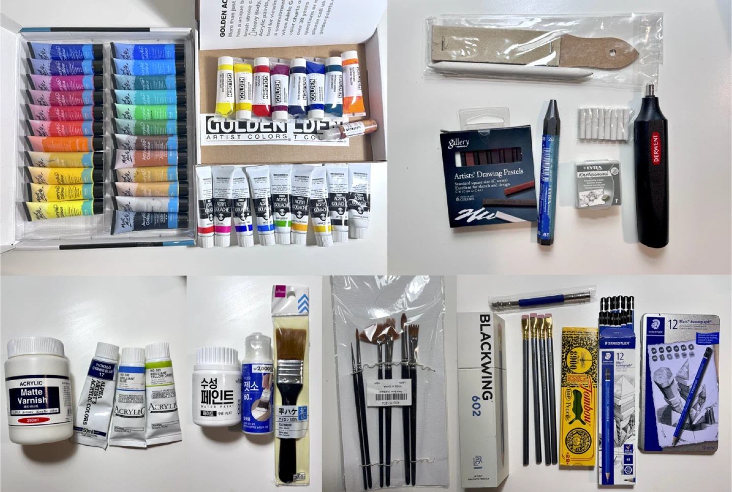 51All for $45 (prices vary for each item individually) Acrylic Paint Sets (many used) Acryla Gouache (barely used) Golden Acrylic sample set (Never used) Pastels (Never used) Blending stumps (barely used) Electric Eraser (Battery Operated) Matte Varnish Acrylic & mediums Art Brushes (flat, round, texture brushes / new & unused) Pencils (Blackwing 4pc, Staedtler 4B 12pc, Tombow 2B 11pc, Staedtler 12pc) All items stored properly and well maintained. 🚚 Moving sale until mid-December — don’t miss out on great deals! 👍🏻 Only cash and Pick up Please, No Return Check out my other listings😊 (A small discount is available if you buy this along with my other listed items.)
