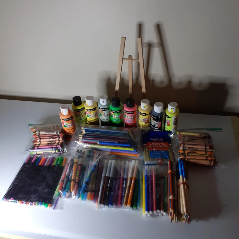 Everything is in good and functioning condition, just lightly used. Pencil crayons, colored pencils, Prismacolor coloring pencils, markers and fineliners, mini easel, glue gun glue sticks, liquid paint. The liquid paint has been used a little, but all bottles still have half to more than a half paint left. Sheppard and Bayview.