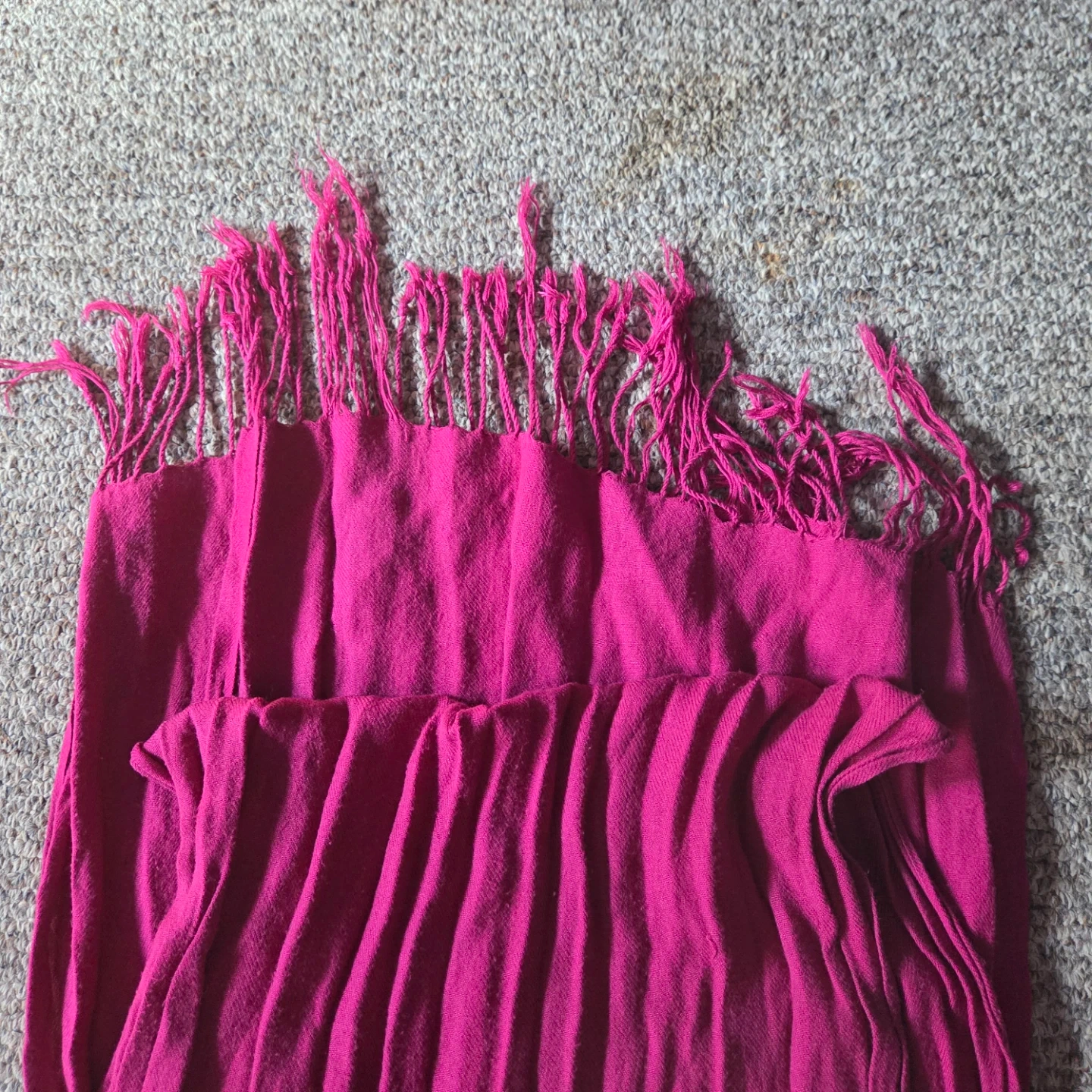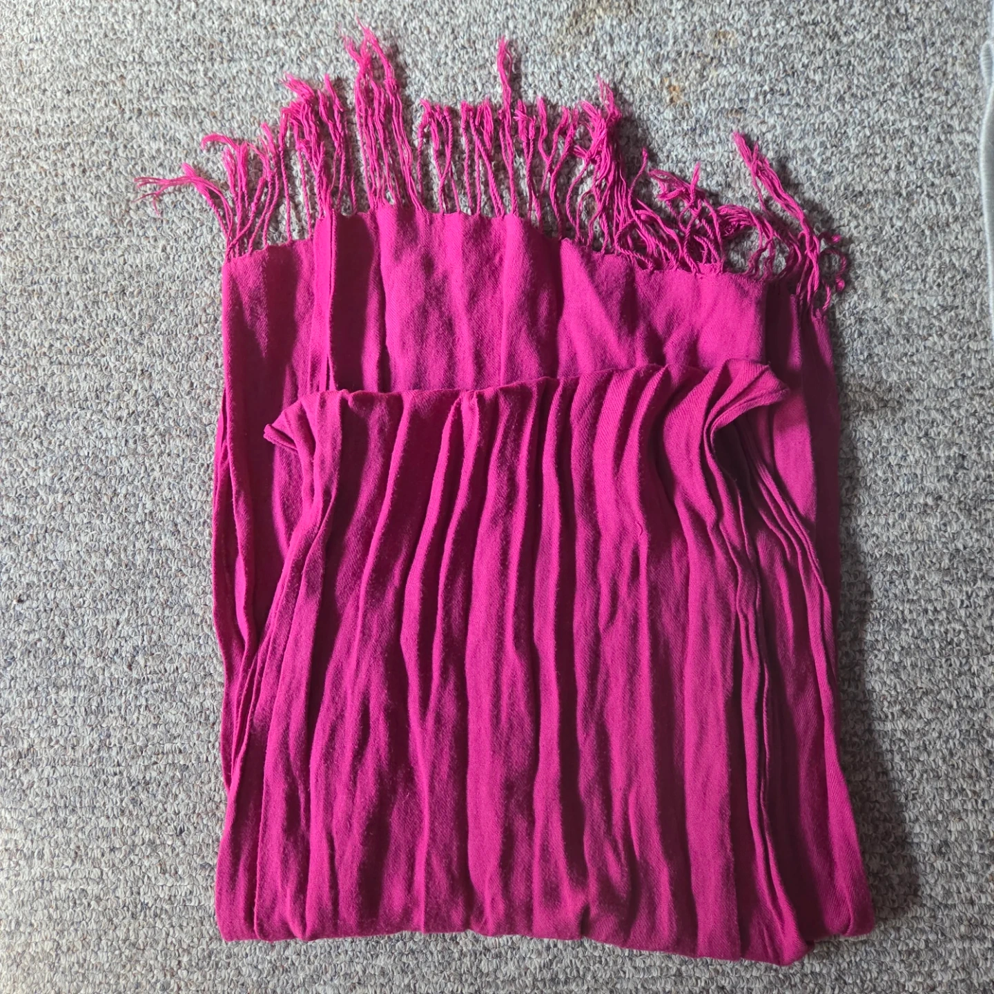 A bright pink scarf with fringed edges. It's made of a soft, lightweight material. This scarf adds a pop of colour to any outfit!