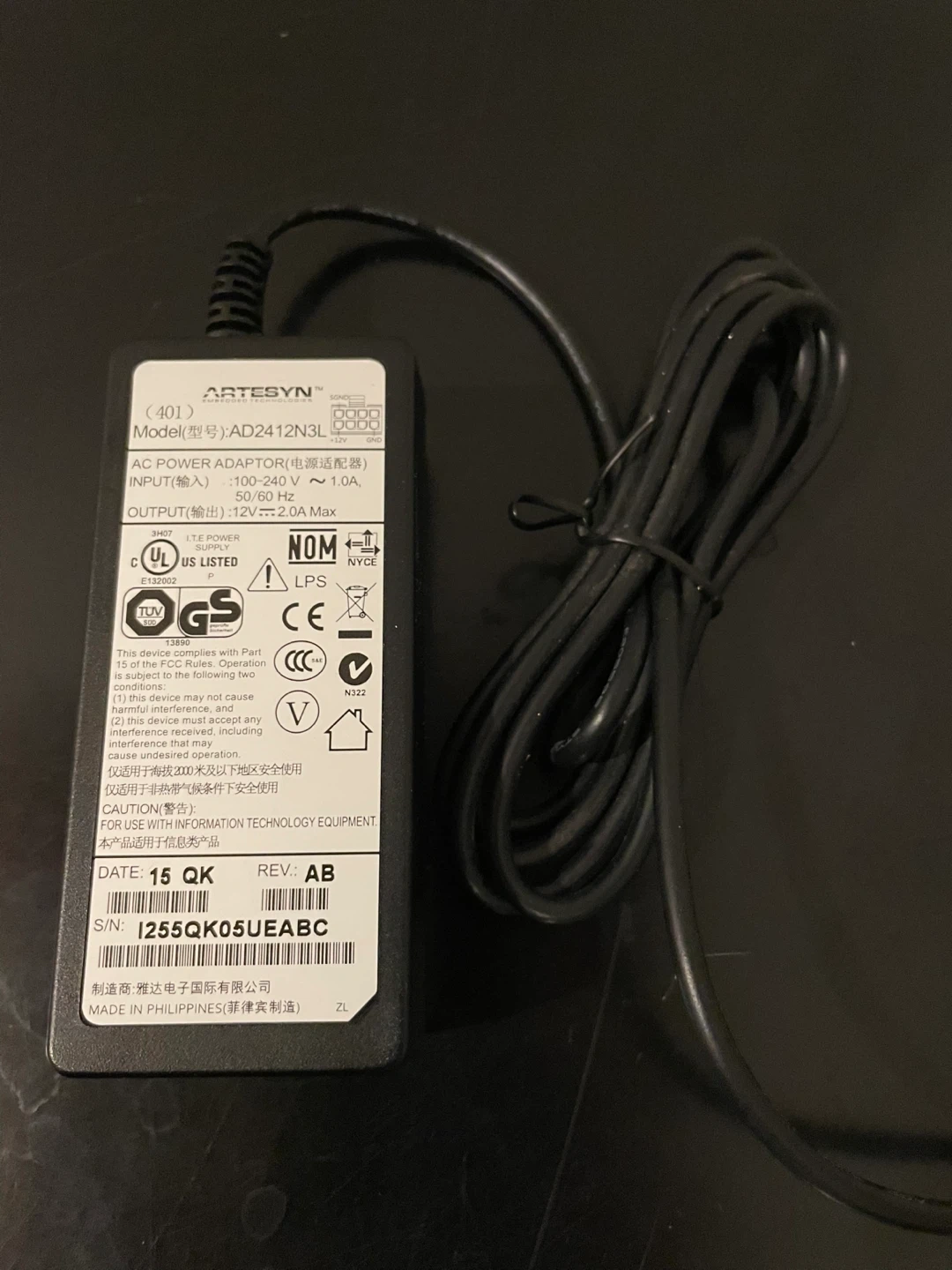 Selling an Artesyn AC power adapter, model number AD2412N3L. Input is 100-240V ~ 1.0A, and output is 12V - 2.0A.