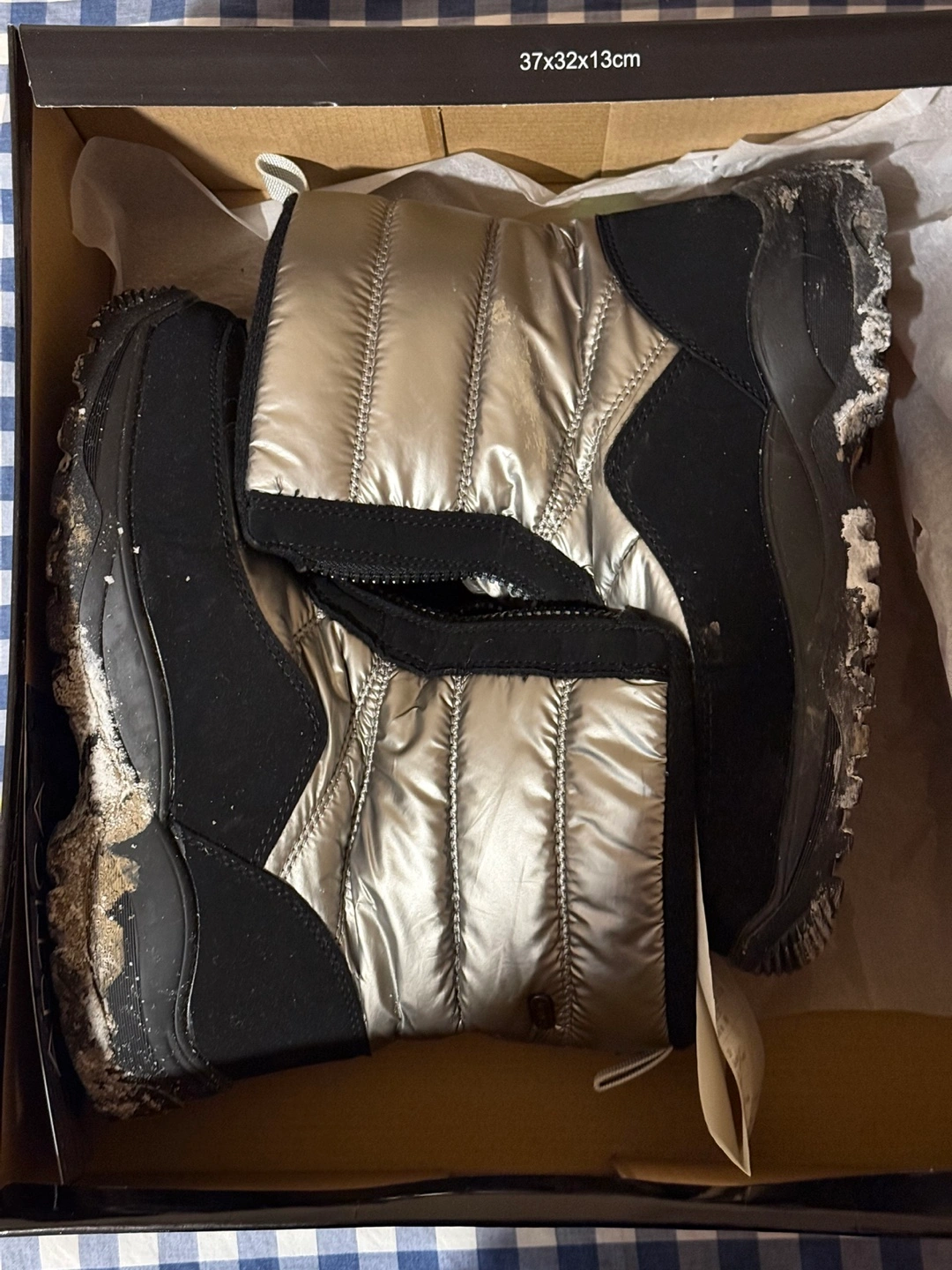 137Pair of women's snow boots. Silver puffer upper, black soles. Used condition, some wear visible.