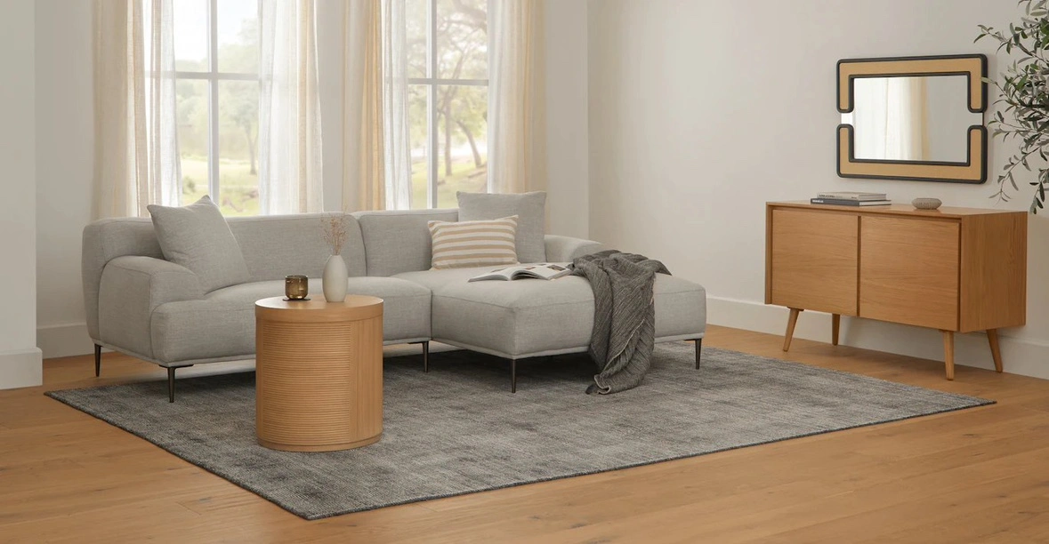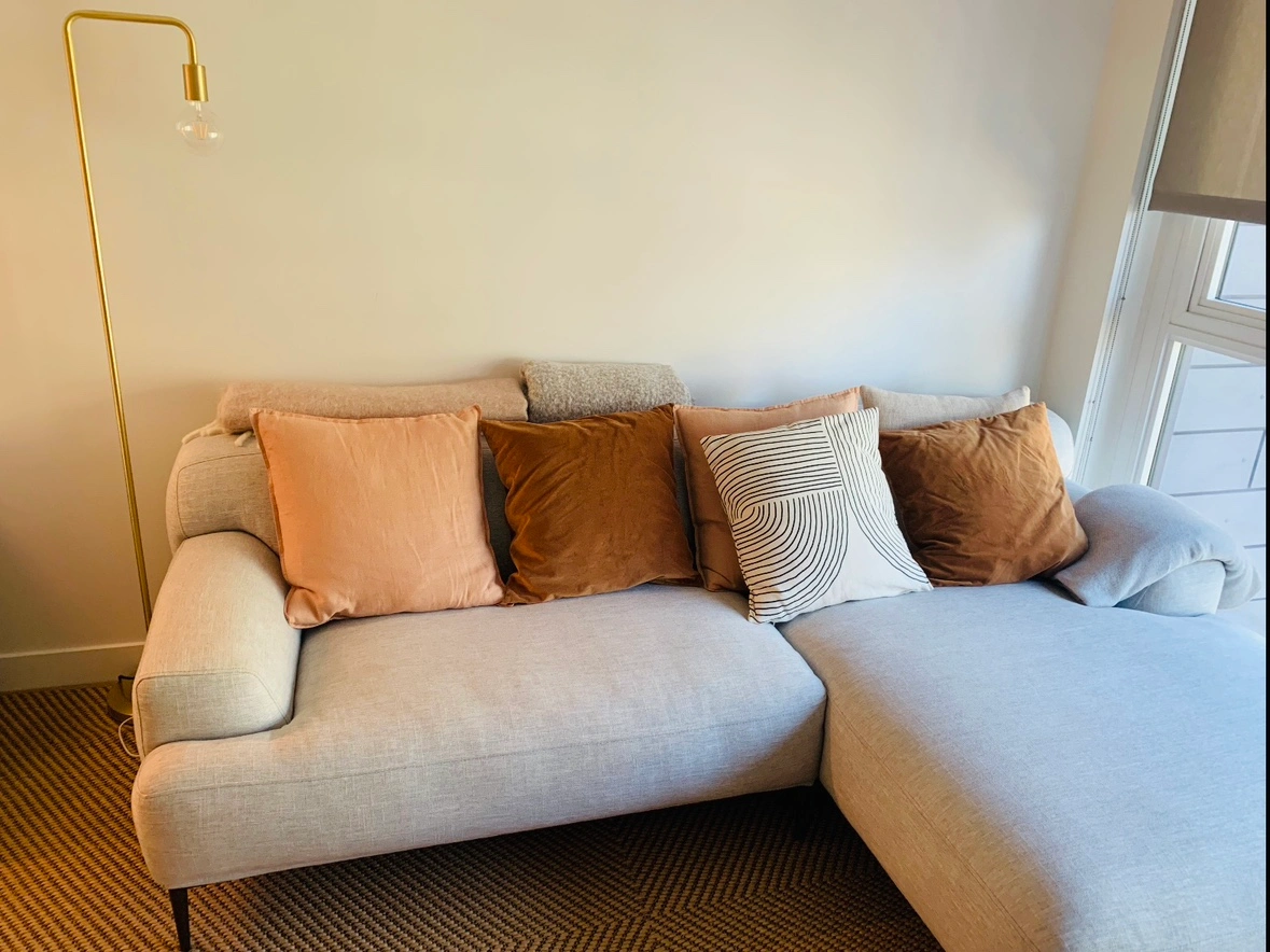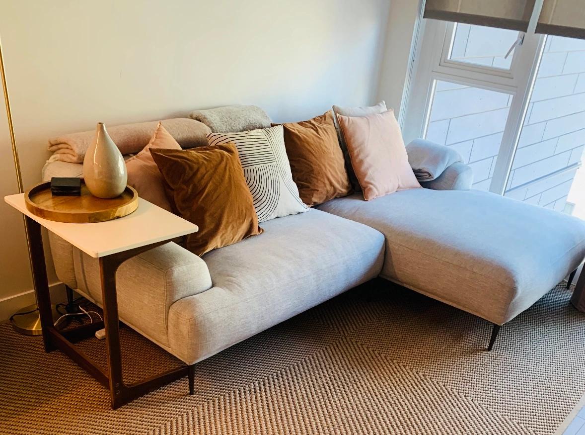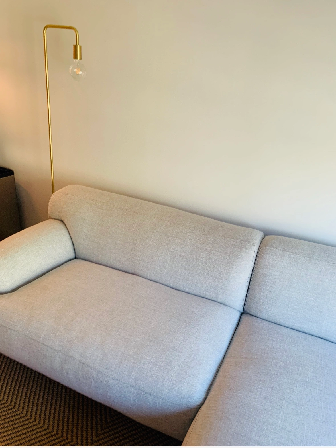 211Stylish sectional couch by ARTICLE (Abisko Mist Gray Right Sectional). Soft gray upholstery with titanium-finished legs. Rarely used and in excellent condition. Purchased for $2399 selling set for $945. Pickup in Olympic Village or we can deliver to you on September 22nd (only) if relatively close as we have rented a van.