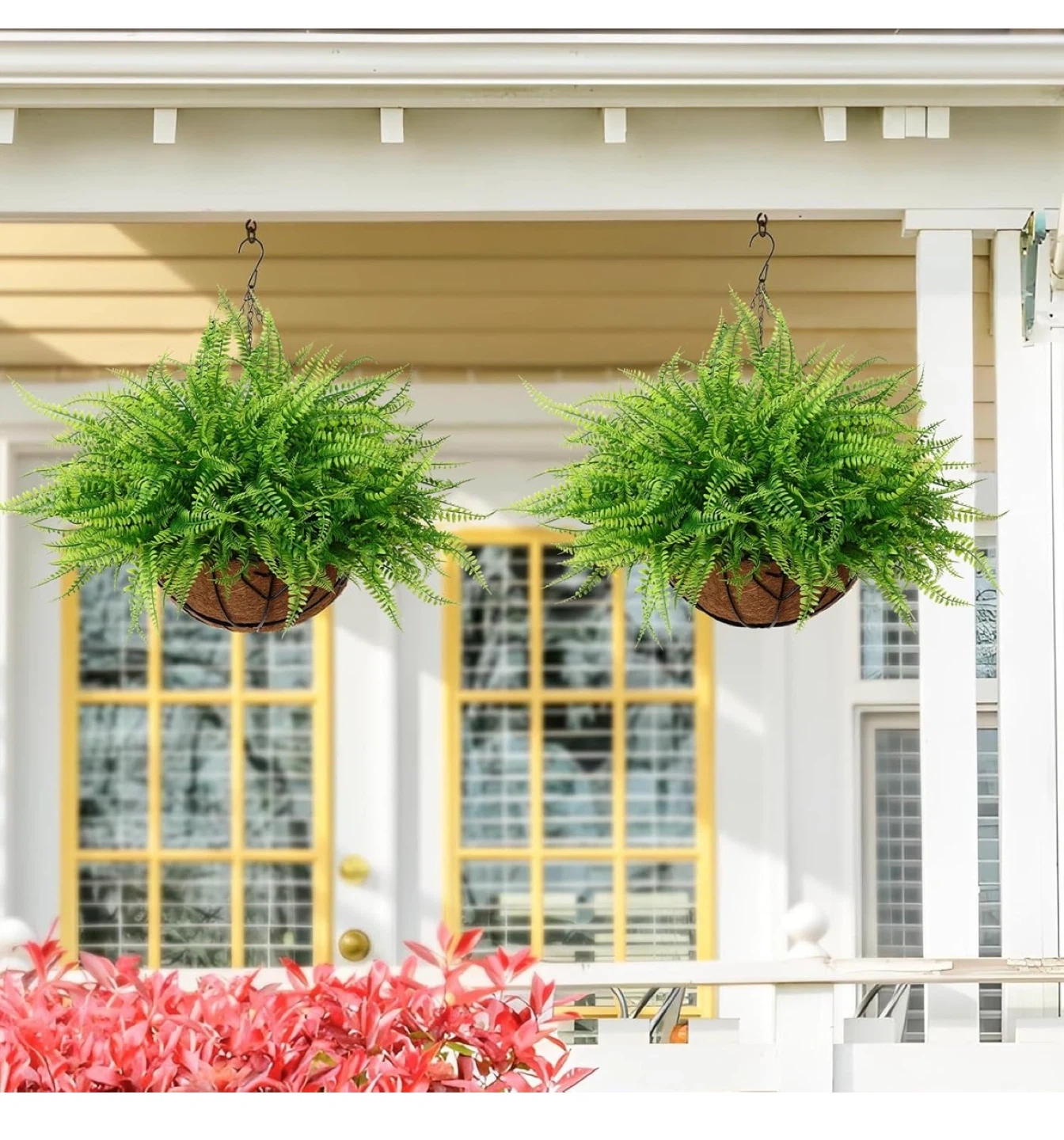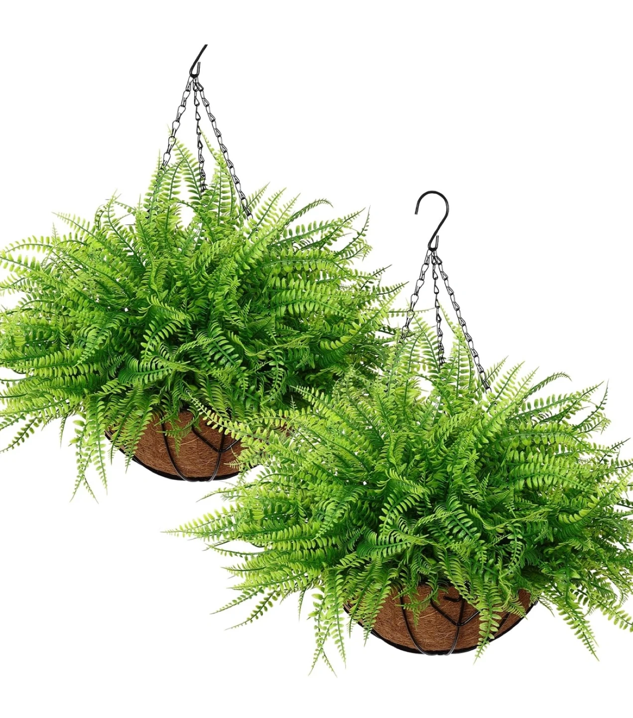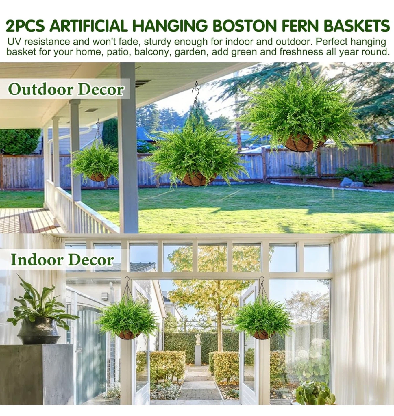 KHOYIME Artificial Hanging Plants with Basket 2PCS Fake Boston Fern Baskets, Outdoor Faux Greenery Stems Hanging Decor UV Resistant Indoor Outside Decorations for Home Garden Porch Balcony Patio Yard