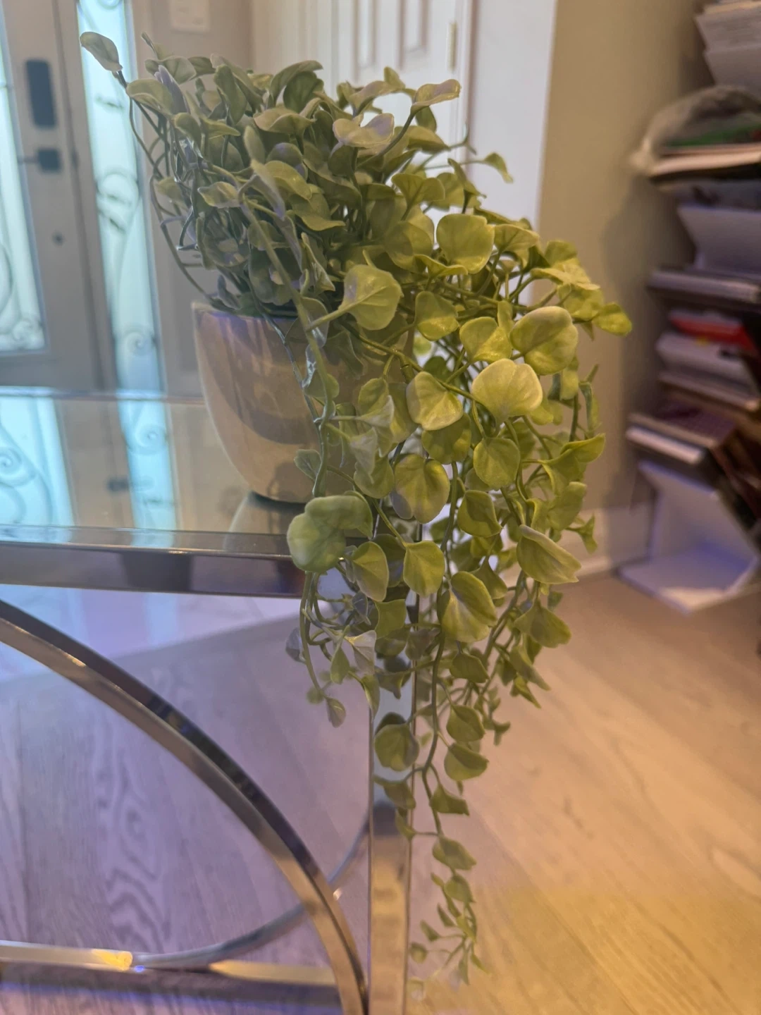 This is a lovely artificial trailing plant in a pot. It's perfect for adding a touch of greenery to any space without the hassle of watering or maintenance. It's in great condition and ready to brighten up your home! Optional: can be paired up with glass vase, selling for $50