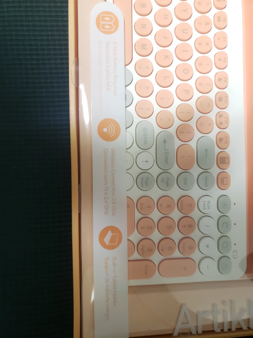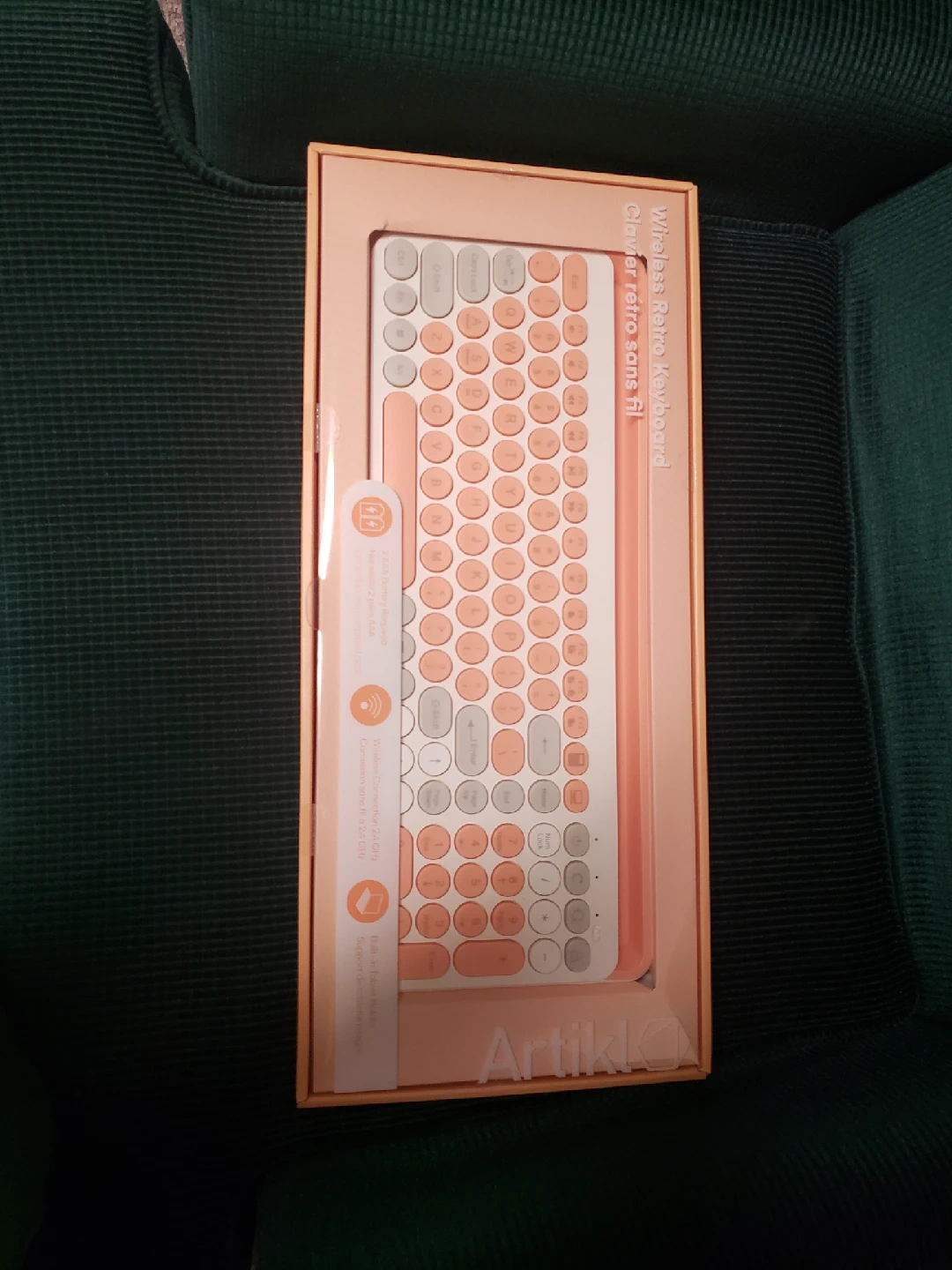 Selling a brand new Artikko Wireless Retro Keyboard, still in its original box! This cute keyboard features a built-in tablet holder and connects wirelessly via 2.4 GHz. It requires 2 AAA batteries (not included). Perfect for adding a touch of retro style to your workspace!