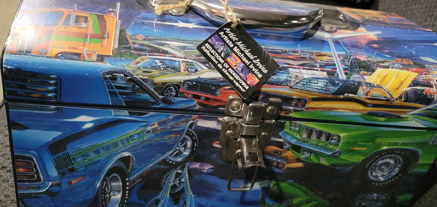 This is a tool box featuring the art of Michael Irvine, titled "Reflections of Horsepower"! It's a unique piece with a vibrant car-themed design. never used asking $95