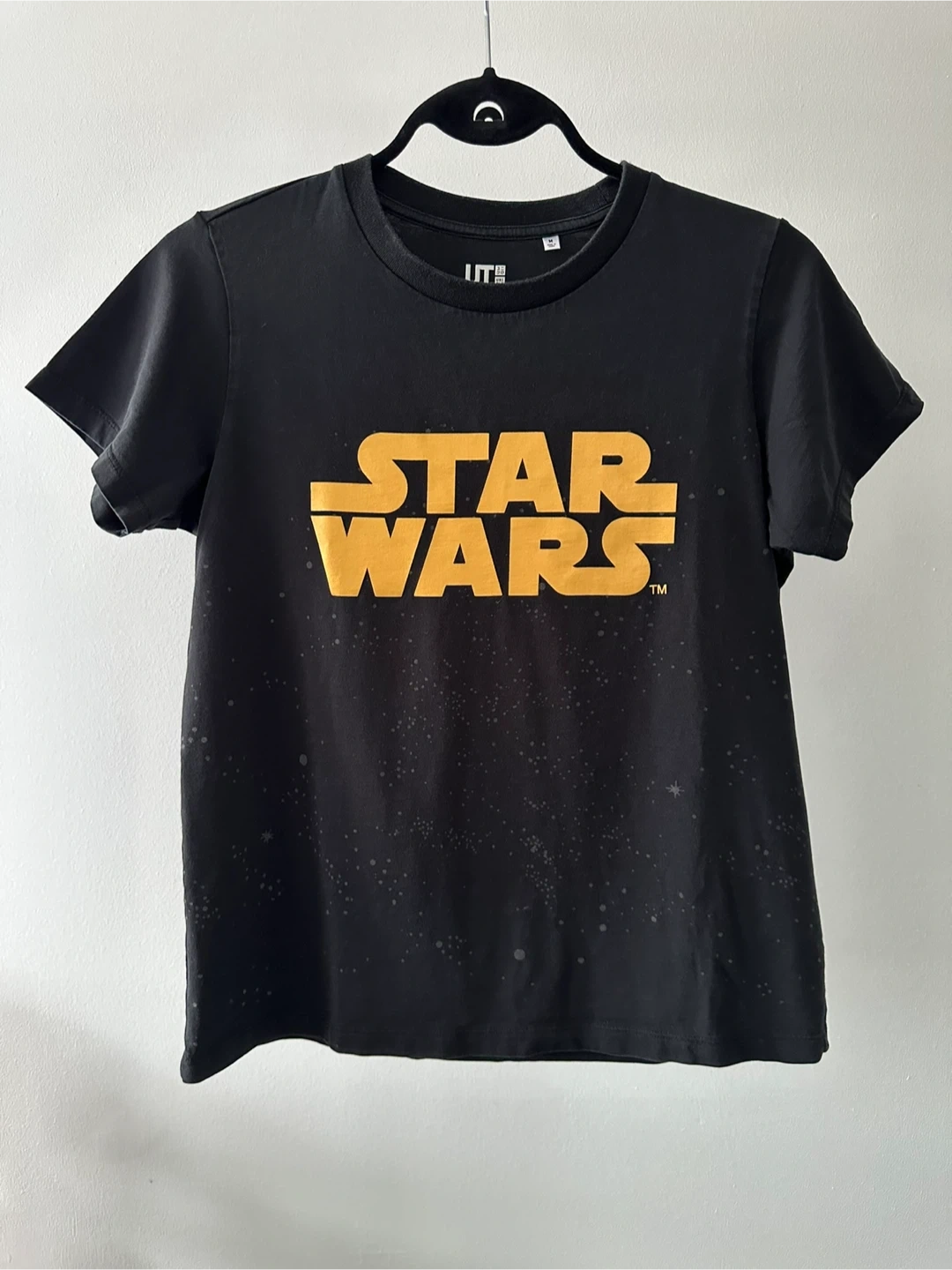 Black Uniqlo UT t-shirt featuring the Star Wars "The Last Jedi" graphic on the back and the "Star Wars" logo on the front. It's a size medium. This tee's perfect for any Star Wars fan!