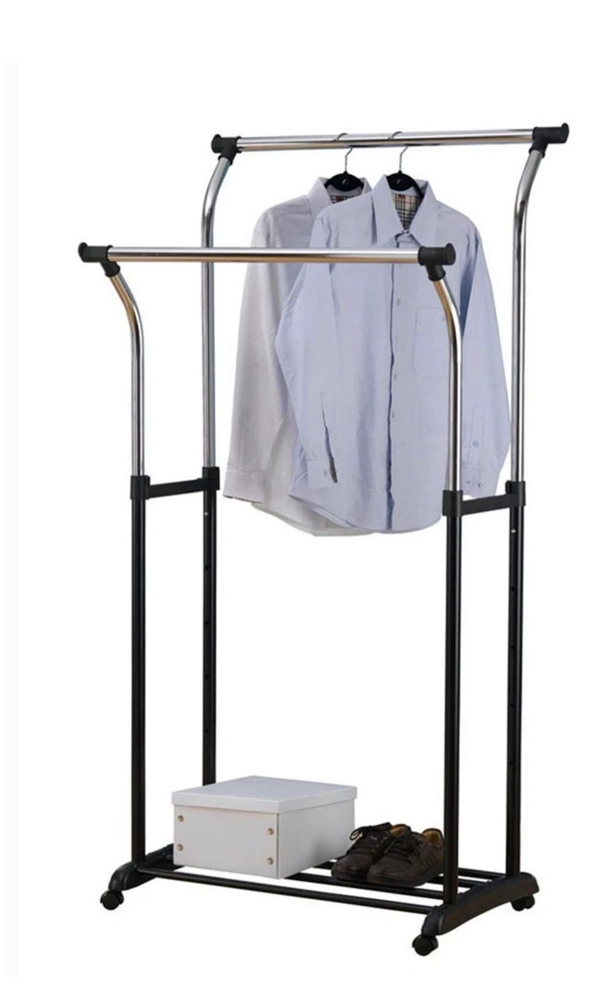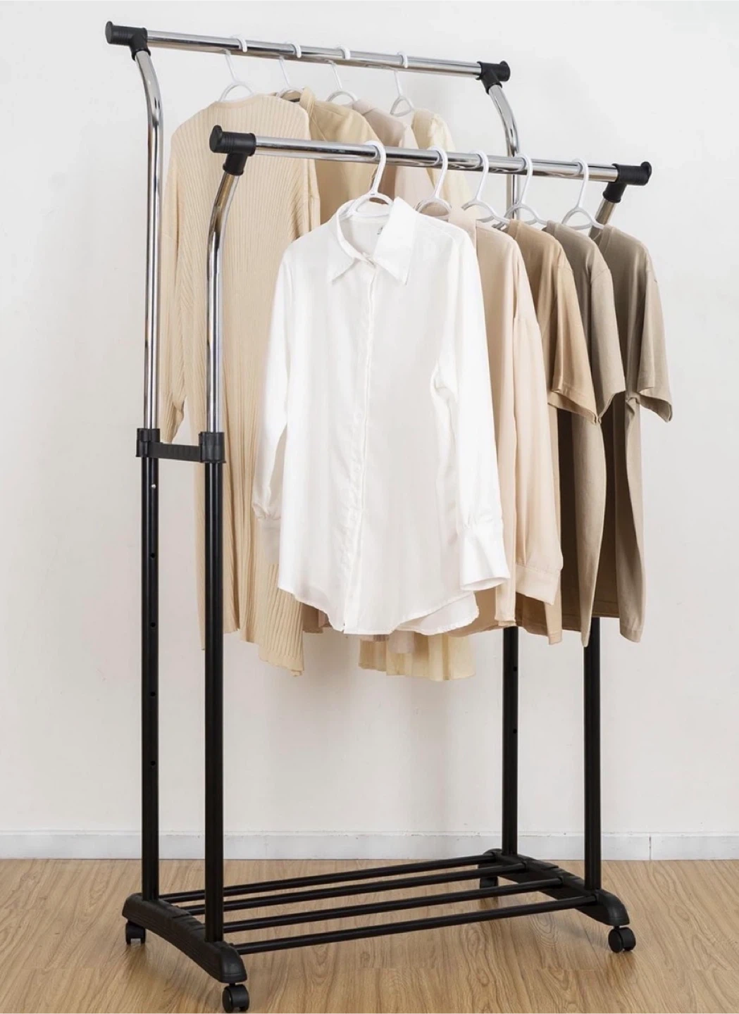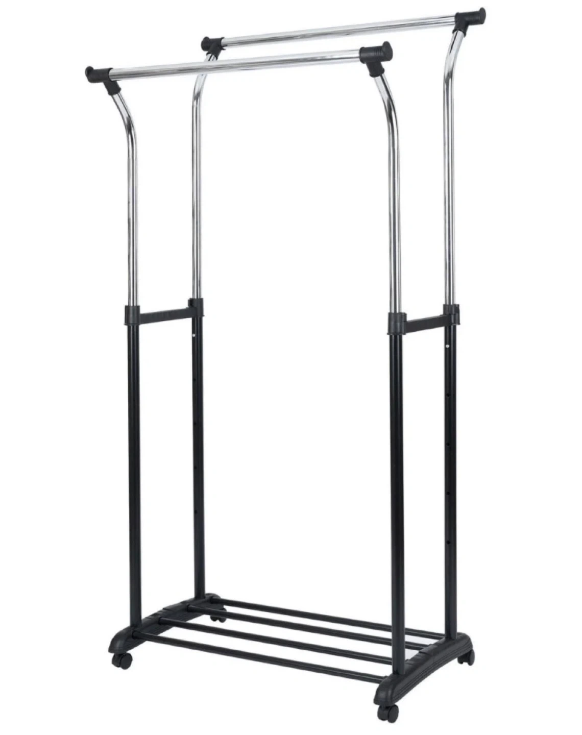 This double garment rack offers ample hanging space for clothes and accessories. It's constructed with durable metal poles and a sturdy base, and features wheels for easy mobility. Includes a bottom shelf for shoes or storage boxes.