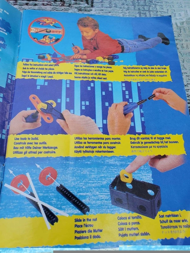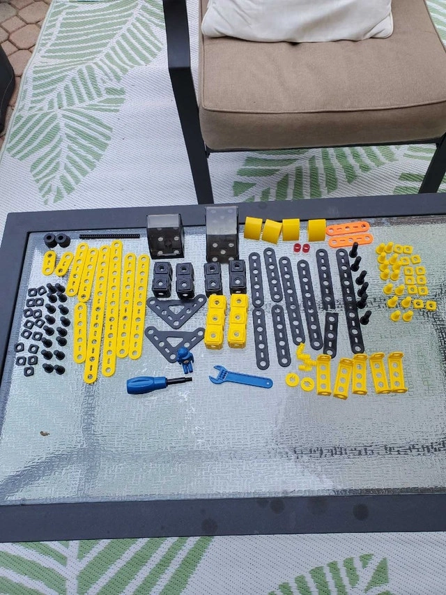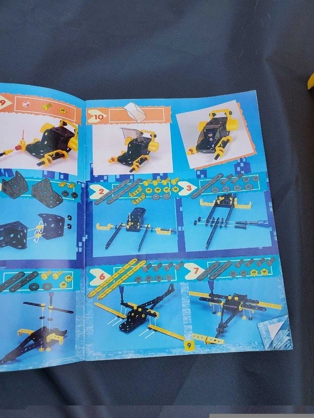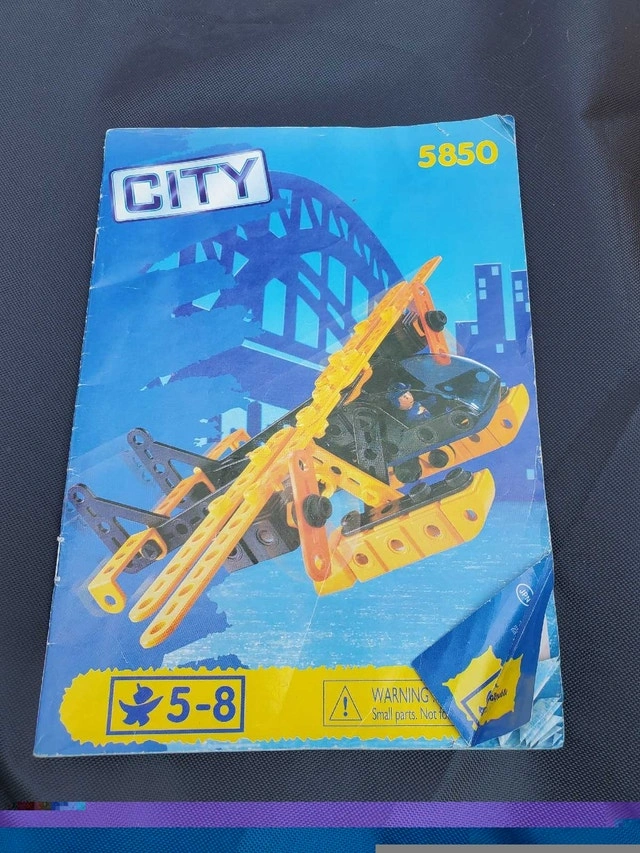 For sale, a 1990's era Meccano Junior City Set #5850 Seaplane building set. I don't have a parts list, so I can't confirm if it's complete, though it appears mostly so. Includes the manual for building the seaplane and other optional builds. Selling as a parts bag only. Original instruction manual is included, but no original box or packaging. Recommended for ages 5-8. Please note, as shown in the photo, there are two damaged pieces: the black one is broken in two, and a piece is missing from the yellow connector. A complete version of the yellow piece is included for comparison. Stored in a smoke-free environment. Available for pickup only in the Whites Rd / Strouds Ln area of Pickering. Cash accepted.