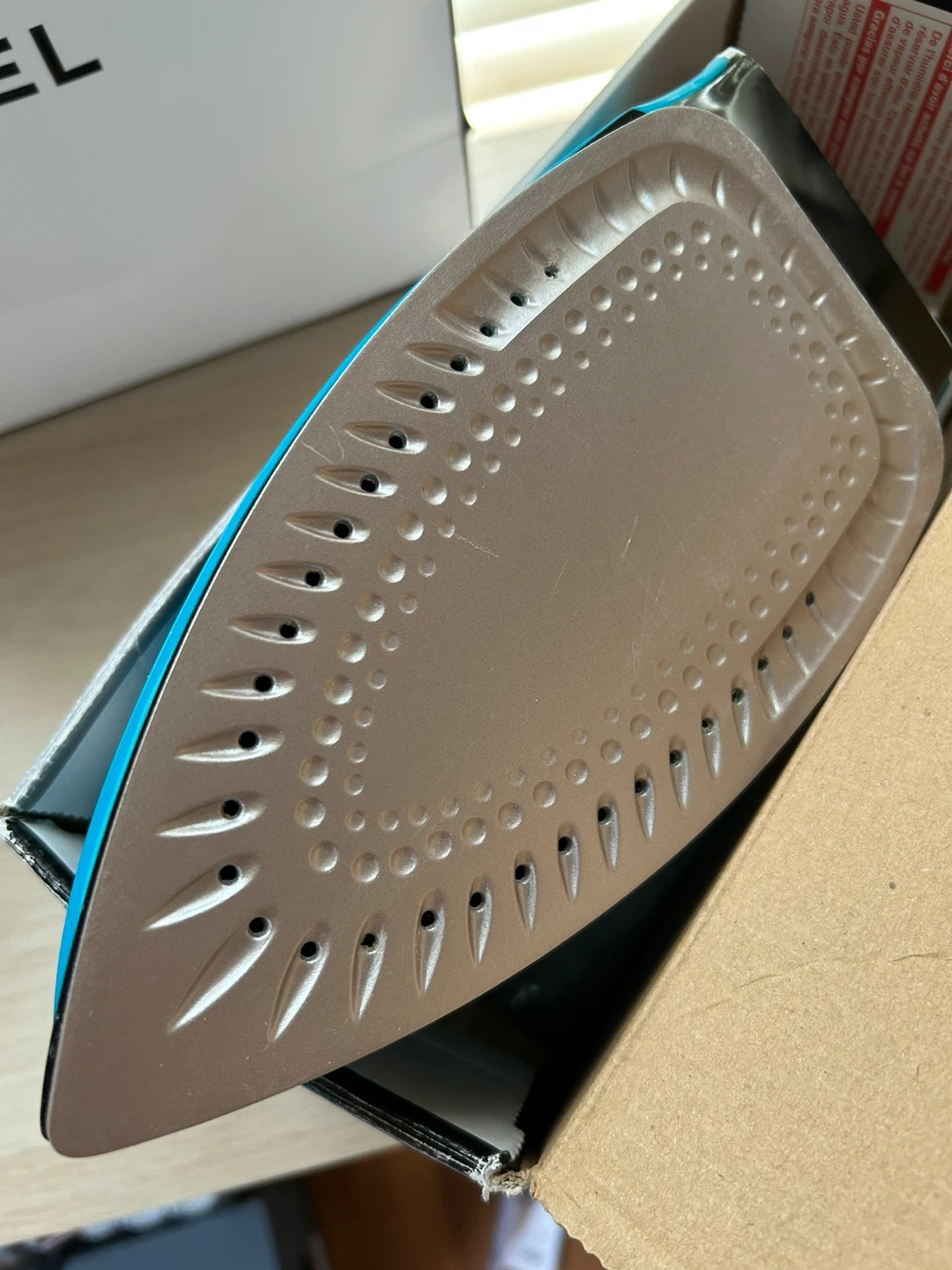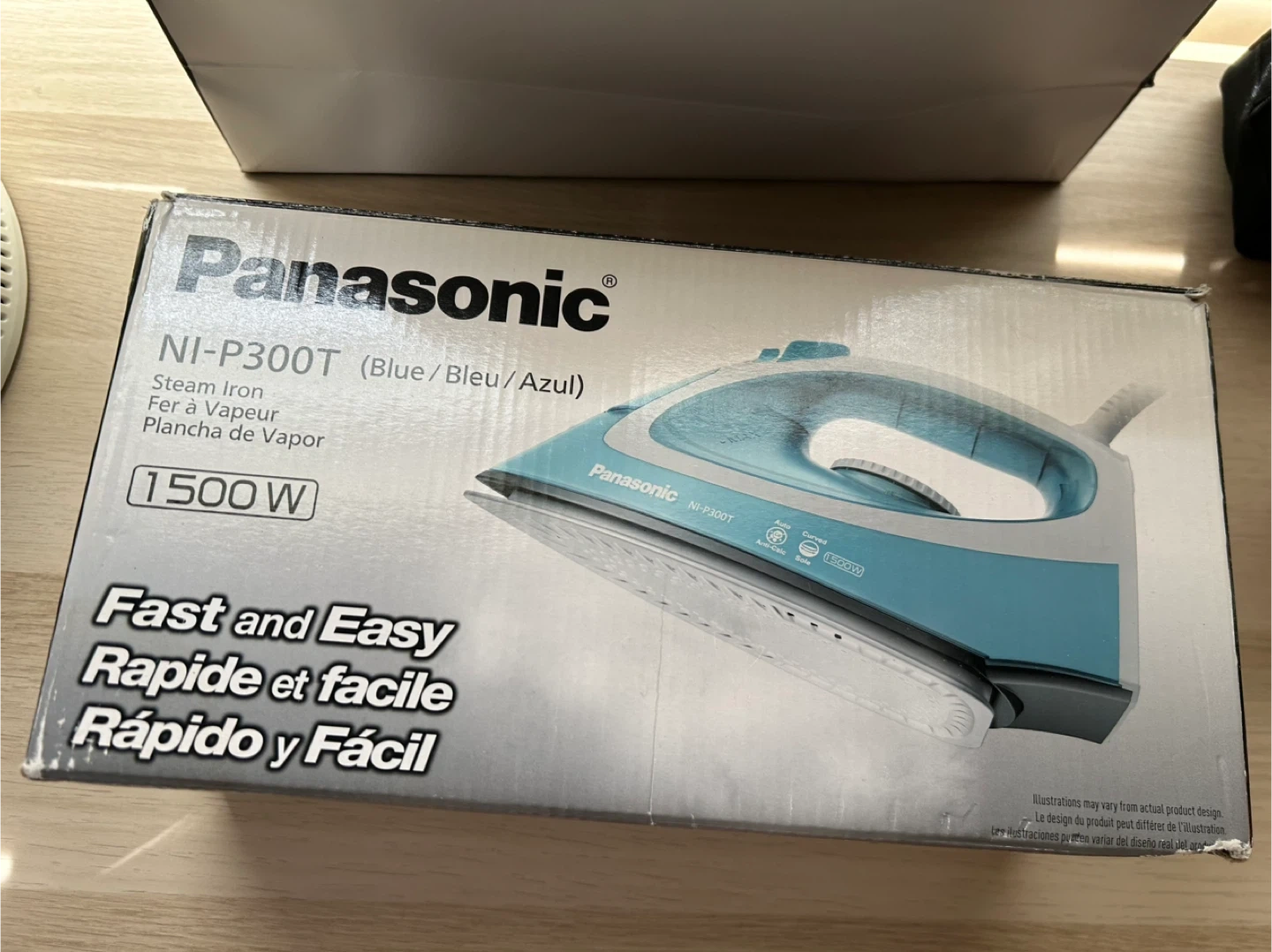 This is a Panasonic NI-P300T steam iron in blue and white. It's a 1500W iron with a durable soleplate. It comes with its original box.
