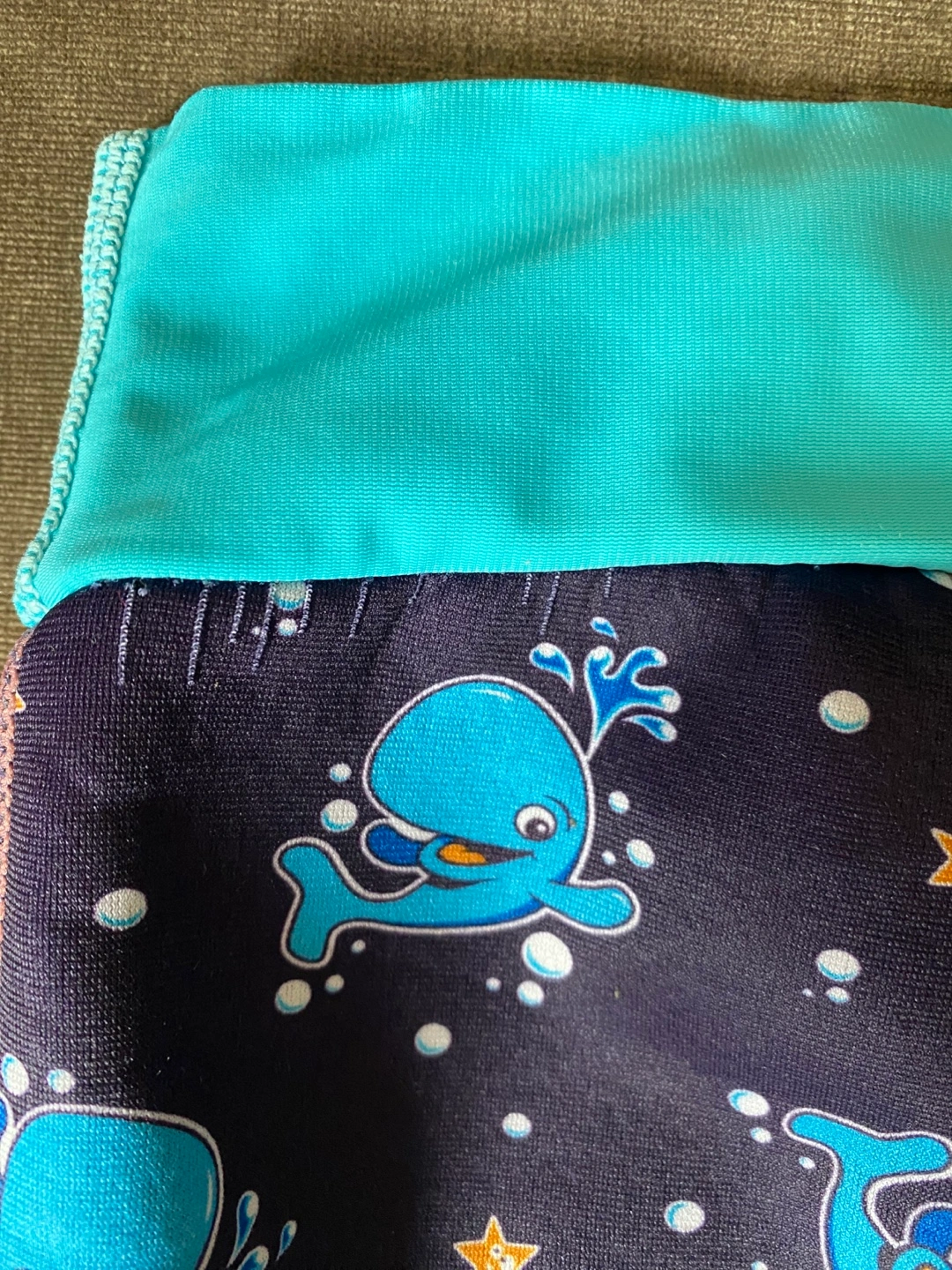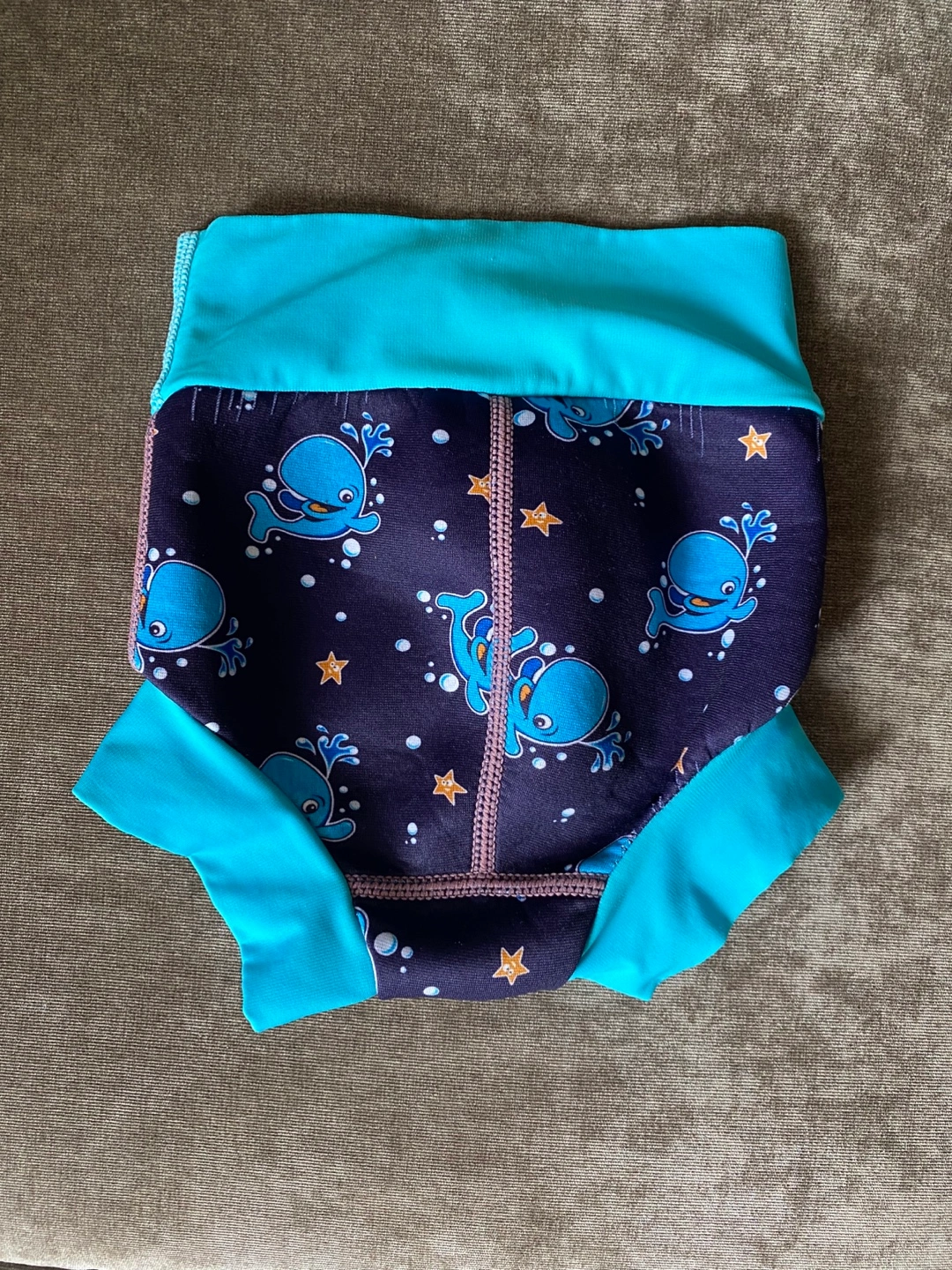 Reusable swim diaper. Teal trim. Whale print. Great for swimming lessons or pool time.