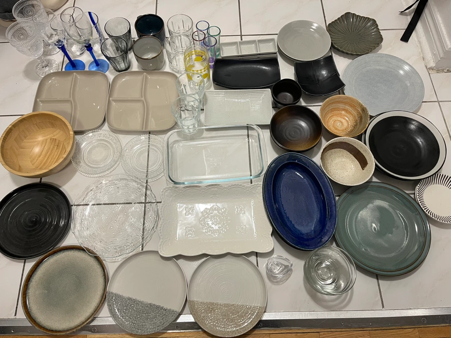A collection of plates, bowls, glasses, and serving dishes. Includes ceramic, glass, and wood items in various styles. Great for building a new kitchen set or adding to an existing one!