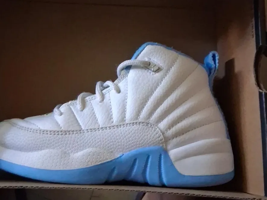 Toddler Air Jordan 12 Retro sneakers. White and light blue colorway. Leather and synthetic material construction.