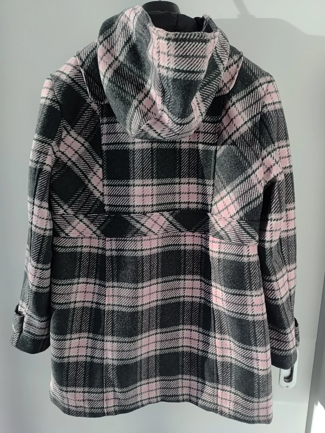Warm hooded coat. Features a plaid pattern in shades of pink and grey. Toggle closures.