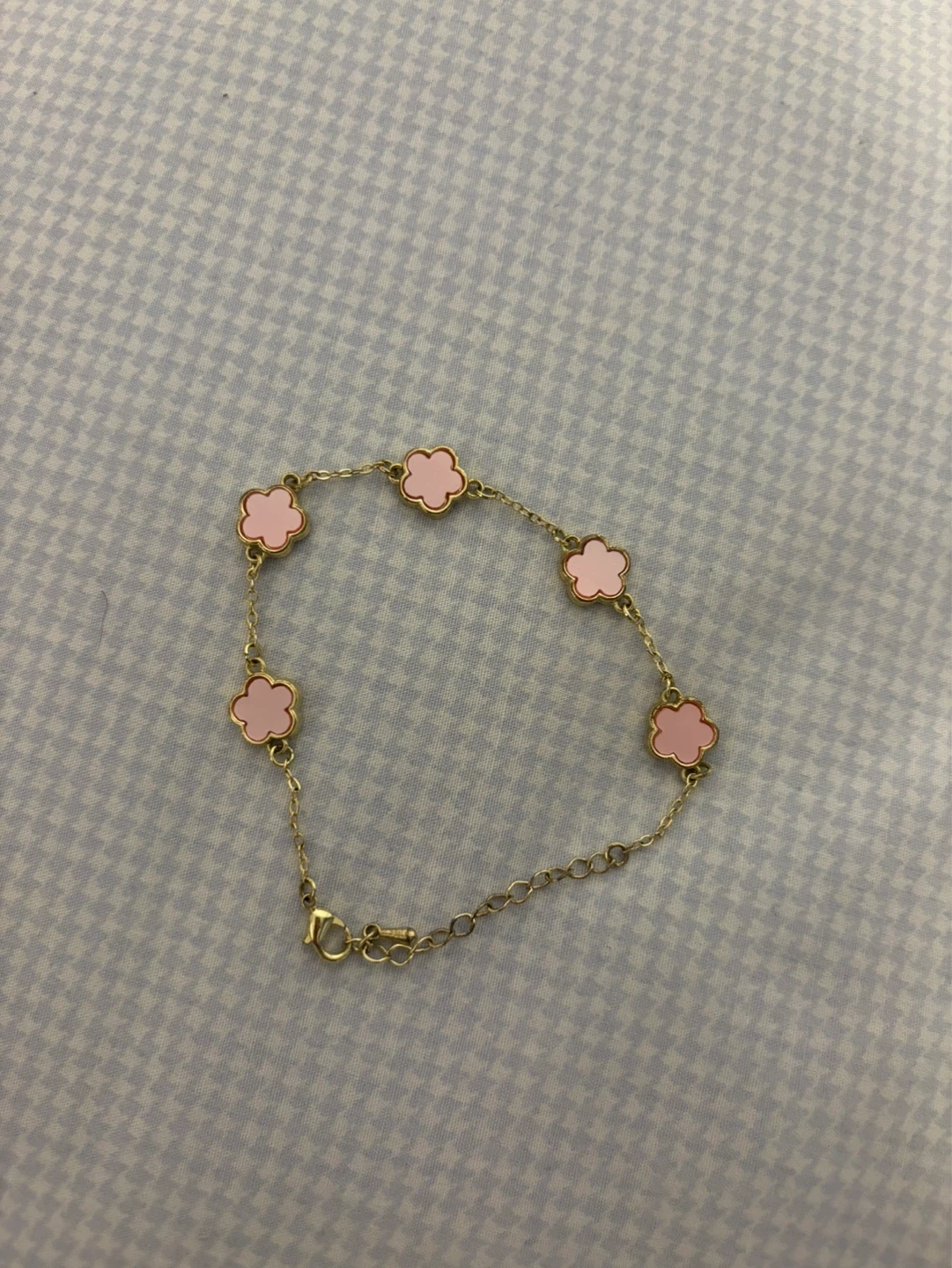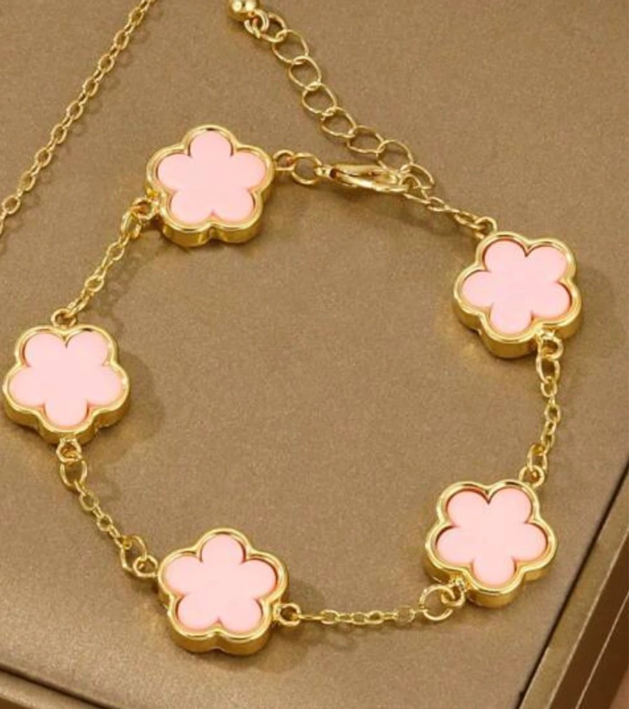 Gold-tone bracelet featuring five pink floral charms. The chain has an adjustable clasp for a comfortable fit. It's a lovely accessory for everyday wear.