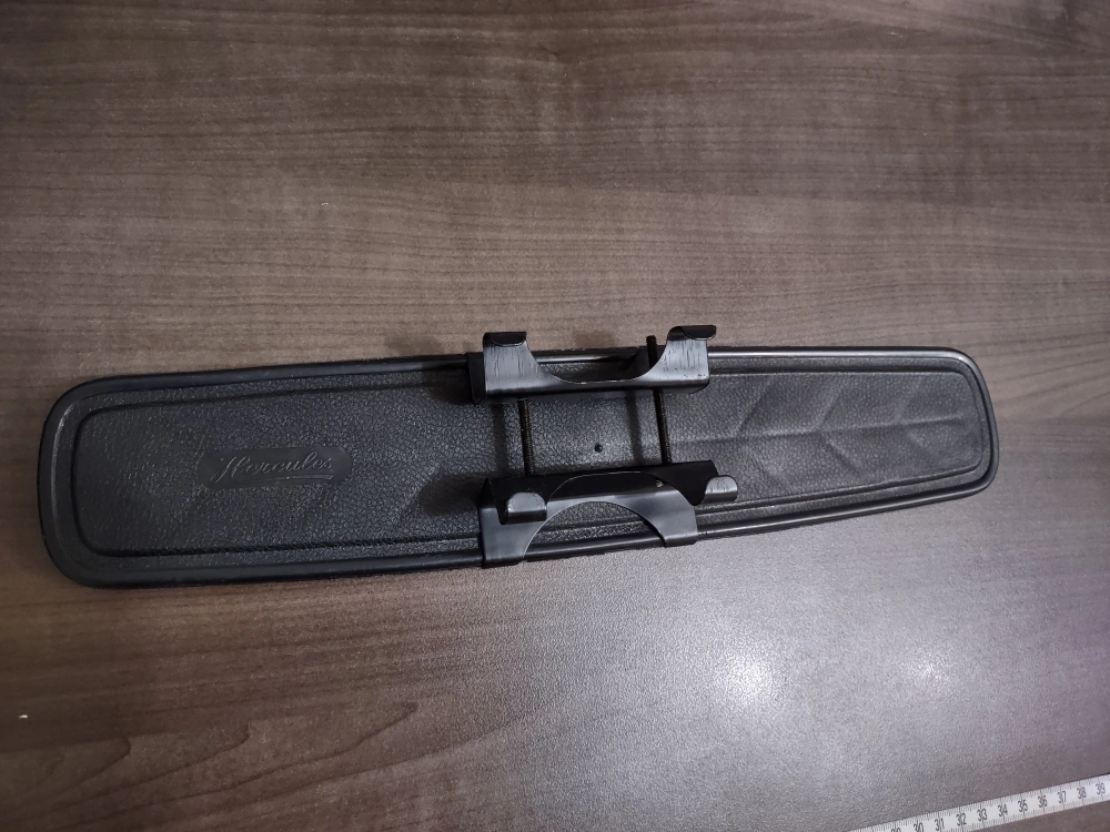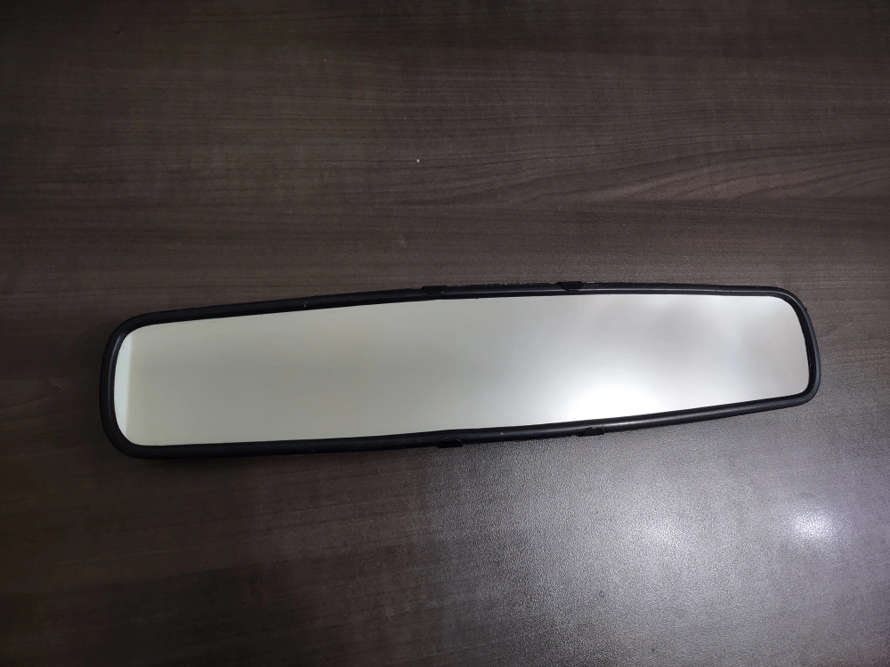 A standard-sized rearview mirror with a plastic frame and a clip-on mounting system. The mirror measures approximately 36 cm across.