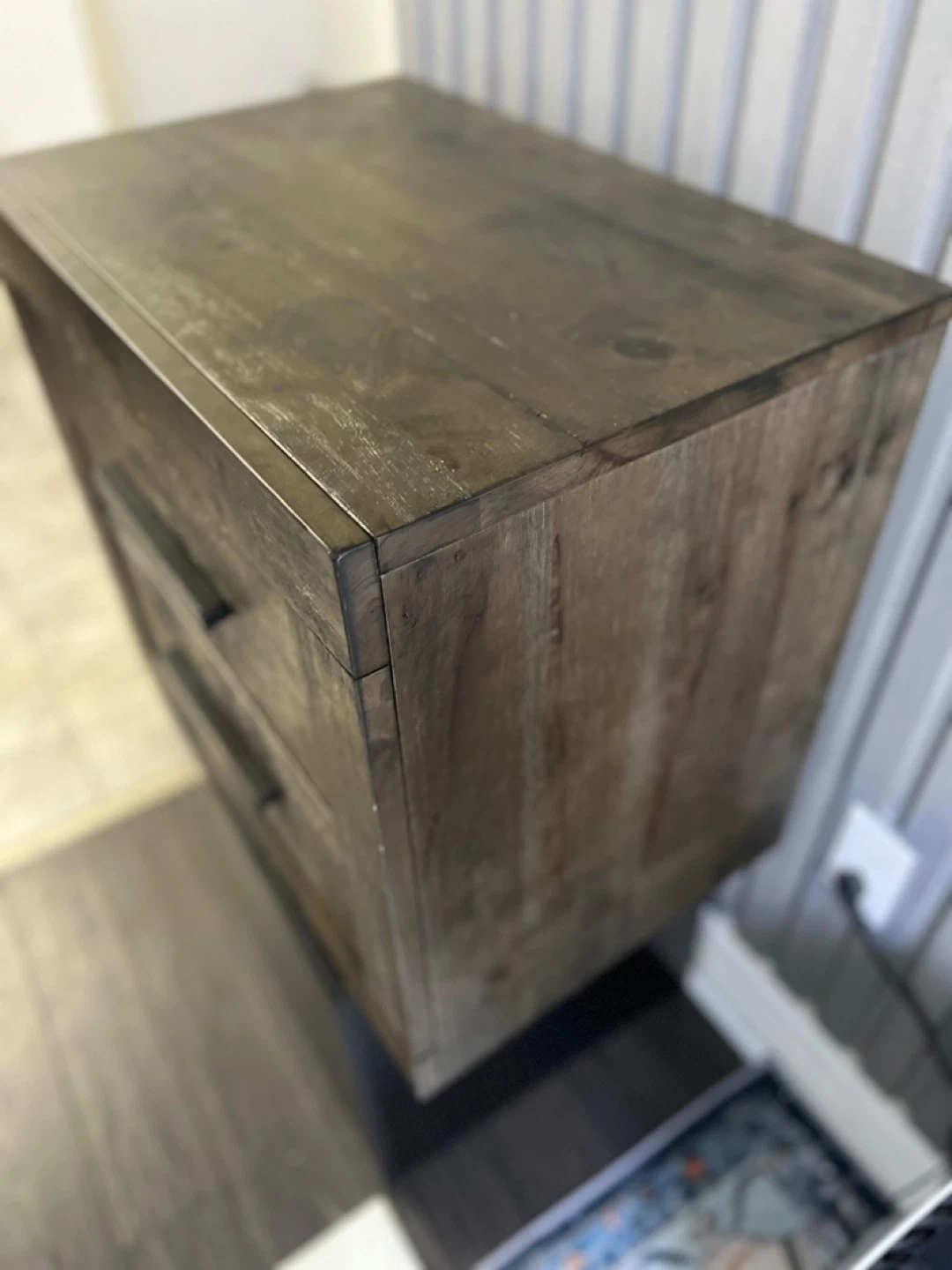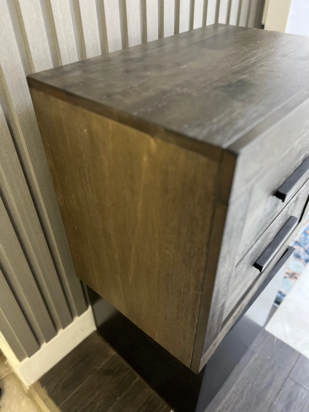 This nightstand has two drawers with black handles. It's made of wood with a dark, rustic finish. Provides convenient bedside storage.