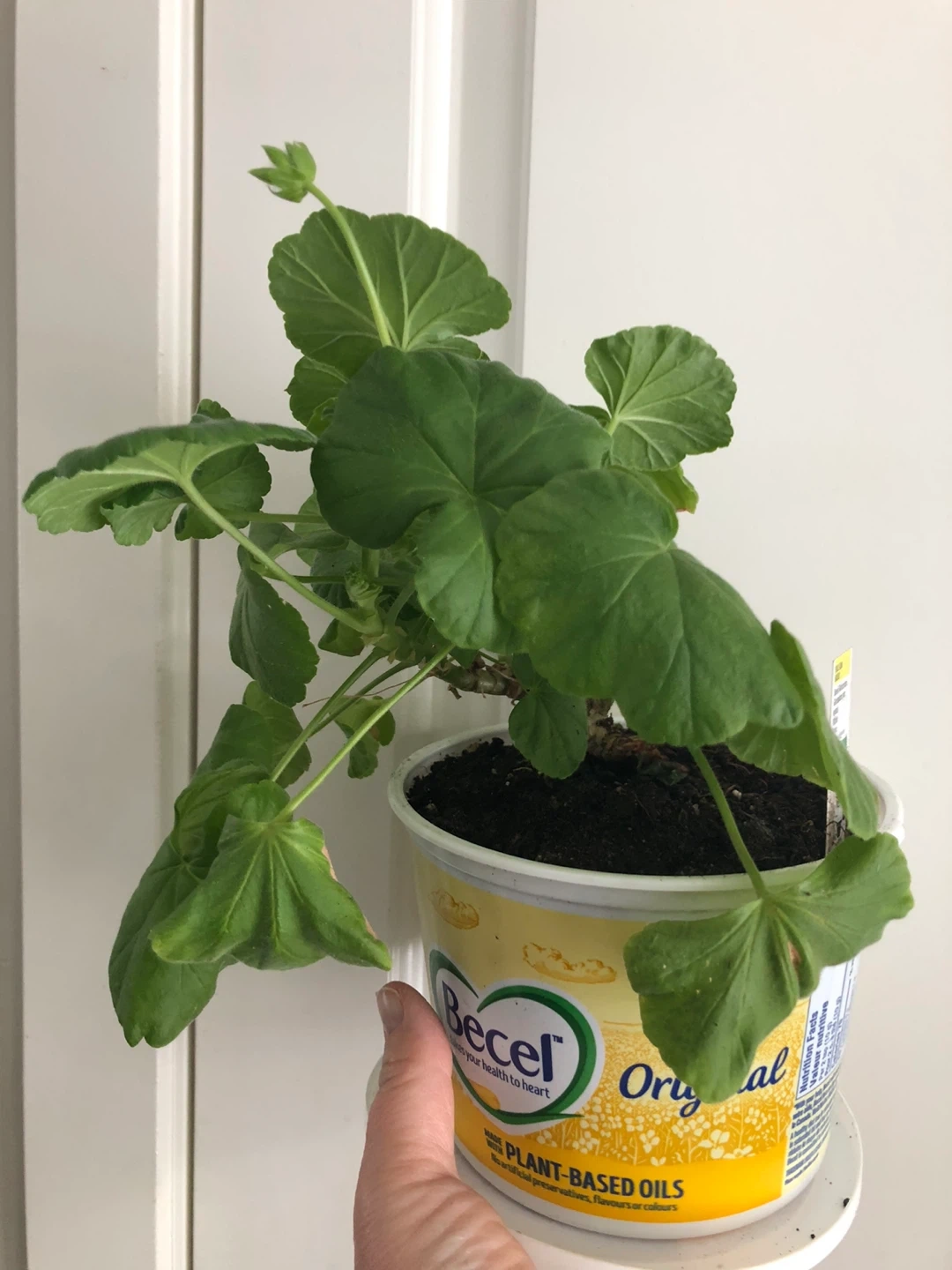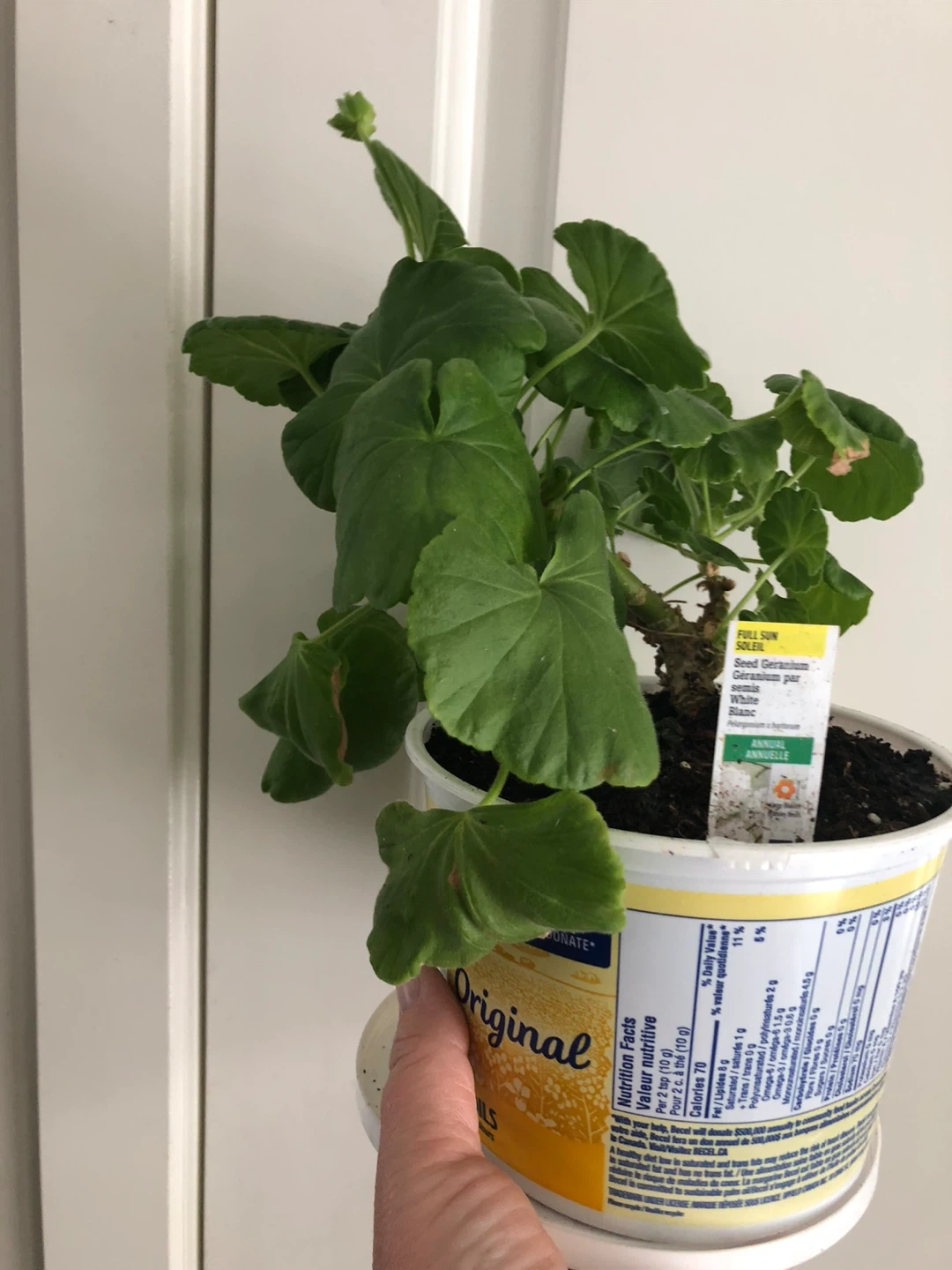 A healthy geranium plant in a repurposed margarine container. It's ready for a new home. This plant's green leaves and budding flowers offer a touch of nature indoors. It's a pretty, low-maintenance addition to any space. About to bloom (white colour). East Kildonan. No delivery.