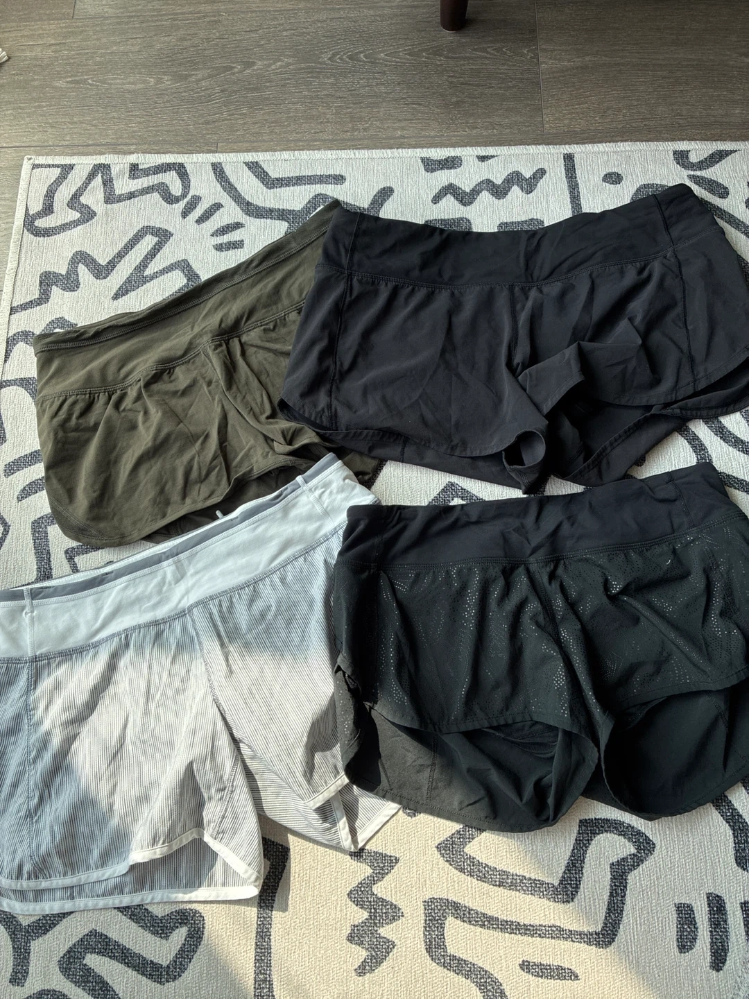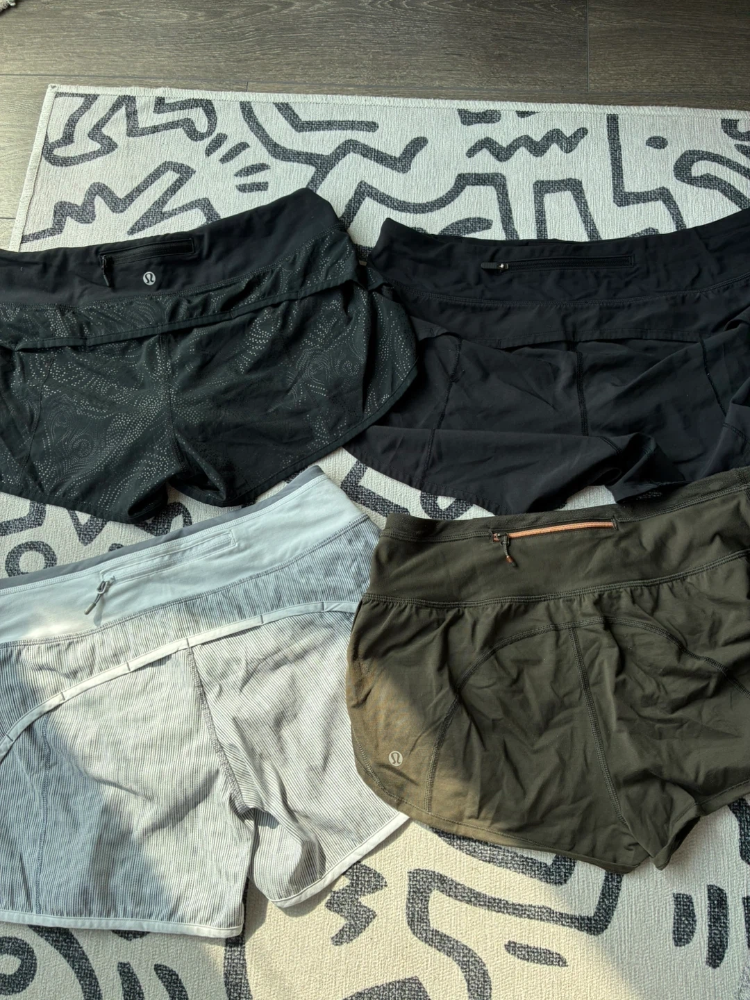 Selling a set of Lululemon running shorts in size 6. There's a mix of colours including black, olive green, and a striped grey/white. They have a small pocket in the back. They're in great condition.
