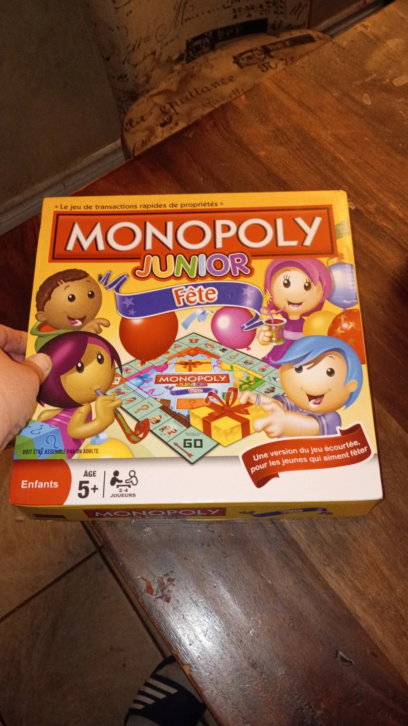 It's the Monopoly Junior Fête version of the classic board game! This game is designed for kids aged 5 and up. Up to 2-4 players can enjoy this shortened game version. GAME IS IN FRENCH!!! pick up only