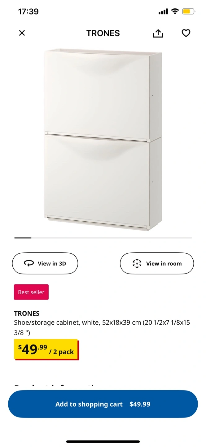 Selling a white IKEA Trones shoe/storage cabinet! It's in great shape and ready to help organize your entryway or closet. These cabinets are super handy for storing shoes, accessories, or even small toys.