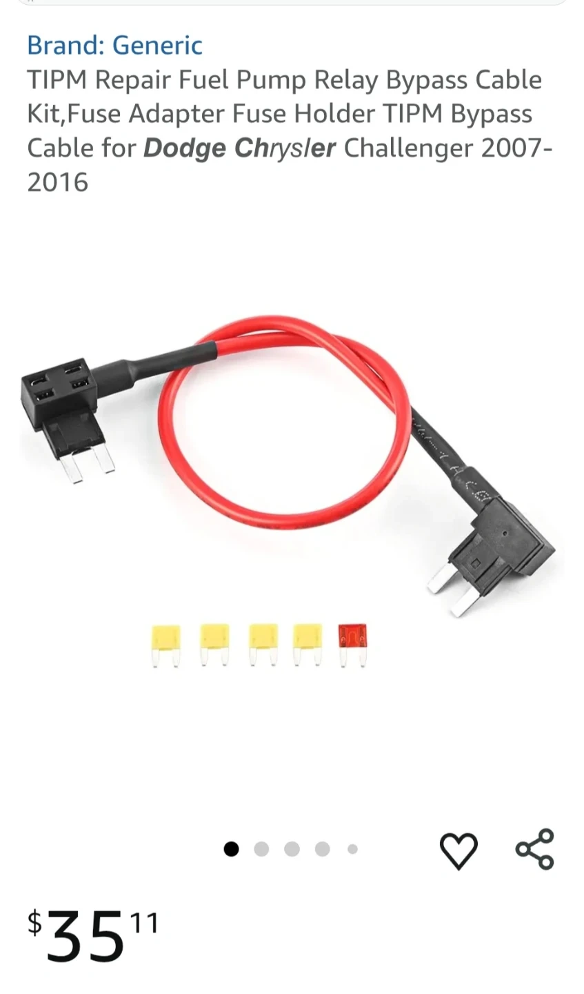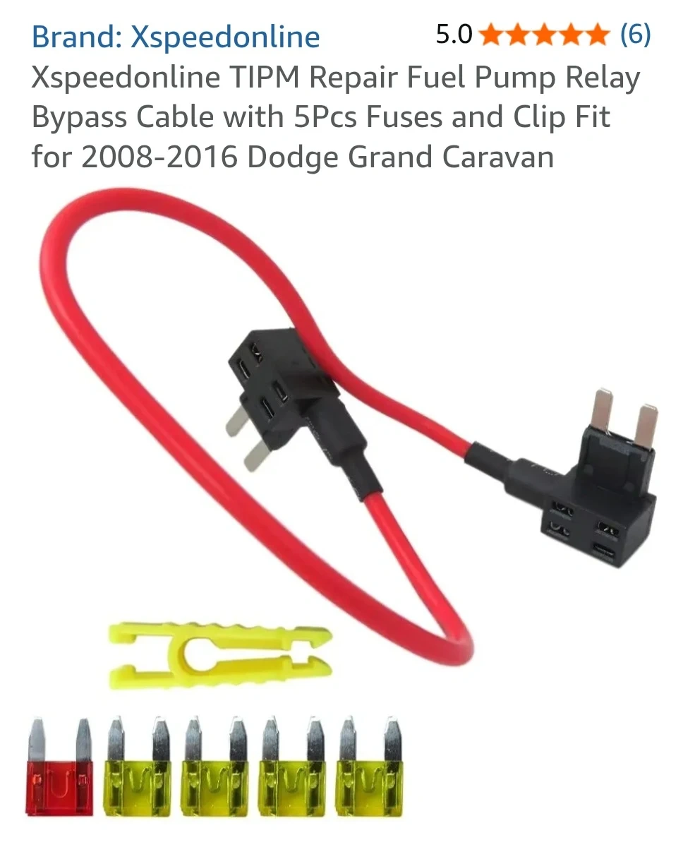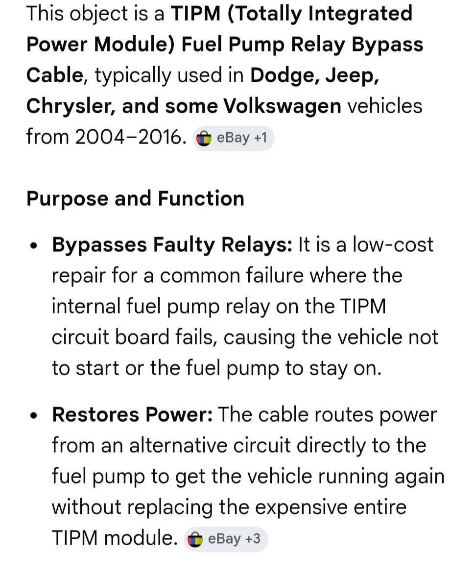 Brand new This is a TIPM Fuel Pump Relay Bypass Cable for Dodge, Jeep, Chrysler, and some Volkswagen vehicles from 2004-2016. It bypasses faulty relays and restores power directly to the fuel pump. The kit includes a red 14 AWG silicone bypass cable and multiple blade-style fuses. This cable is useful for bypassing a failed internal fuel pump relay on the TIPM circuit board without replacing the entire module.