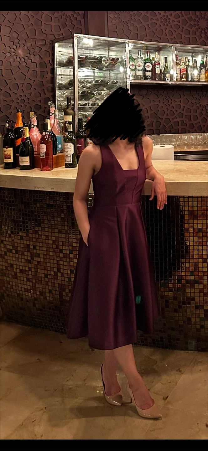 Sleeveless A-line midi dress in a rich plum colour. It features a square neckline and has pockets! This dress is made from a smooth fabric, perfect for special occasions.
