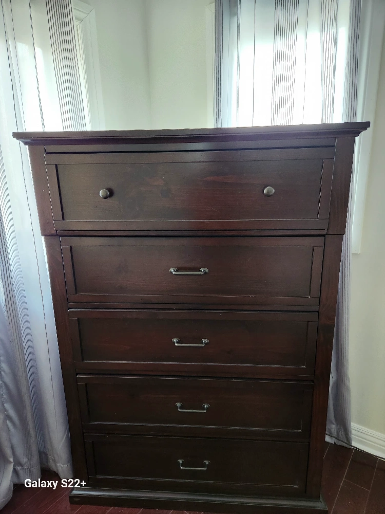 Selling a near new Ashley chest of drawers with a dark brown finish. It has five drawers for ample storage space. the top drawer has a velvet lining. Very well made and a great addition to any bedroom!