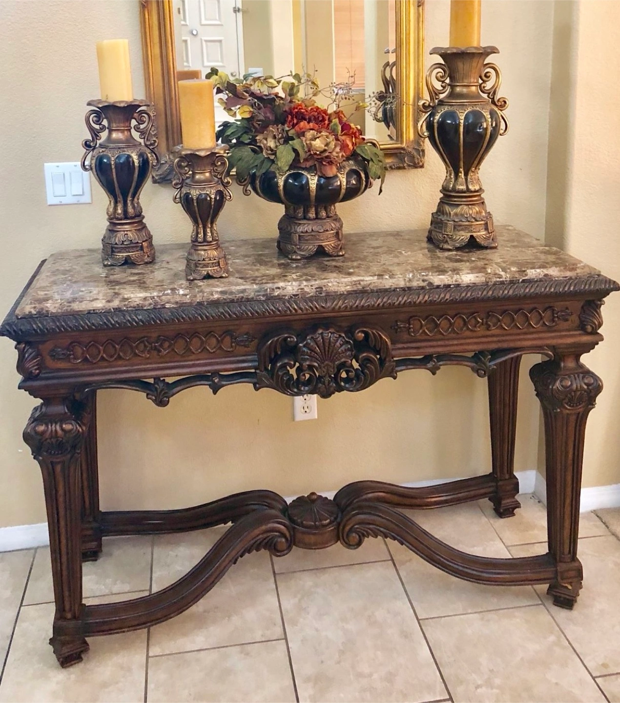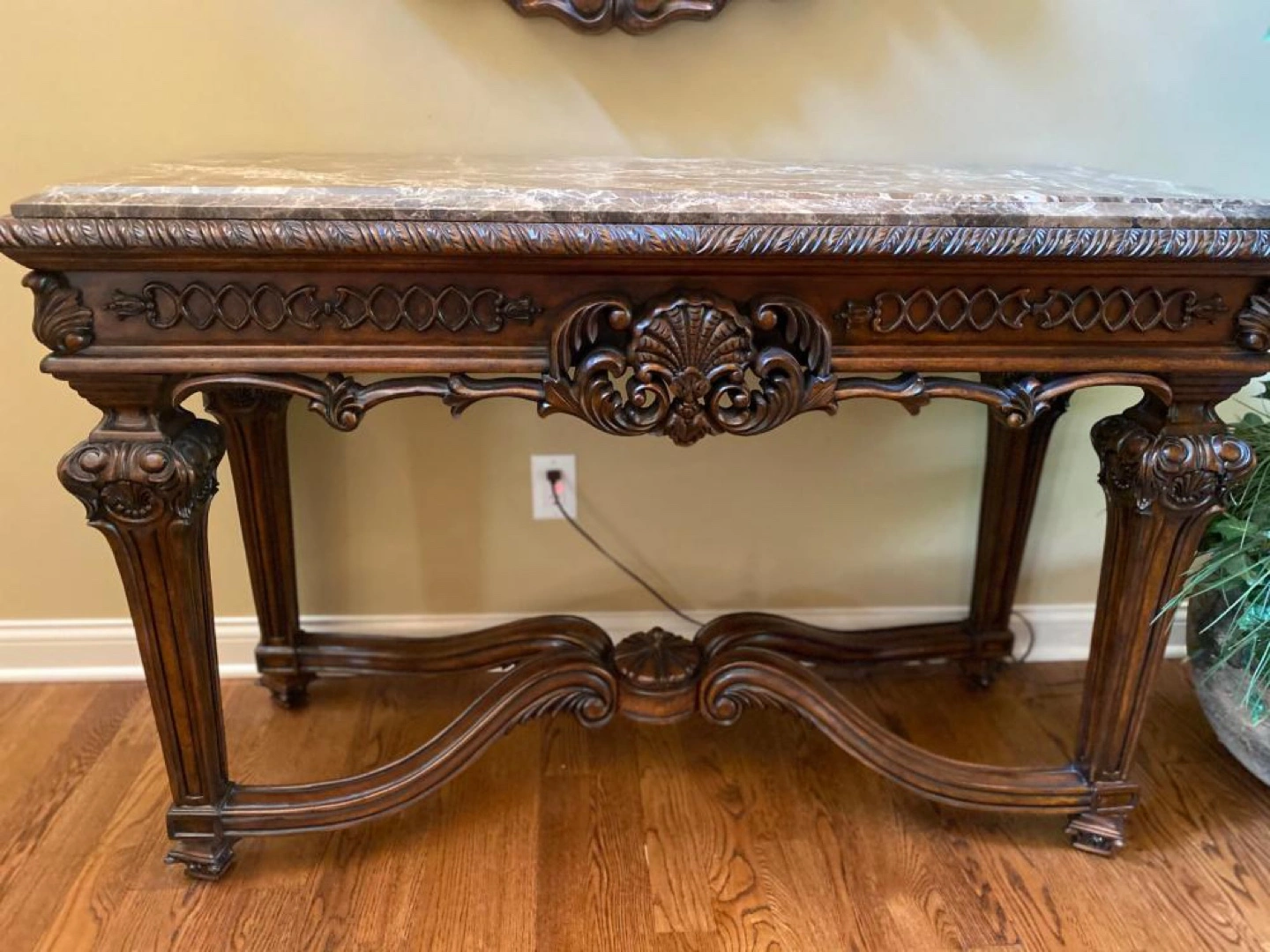 10Beautiful console table with a marble top. It's in perfect condition and would add a touch of elegance to any entryway or living room. Bought it for over 1000$ Sofa set from Ashley is available if you would like which includes a ottoman