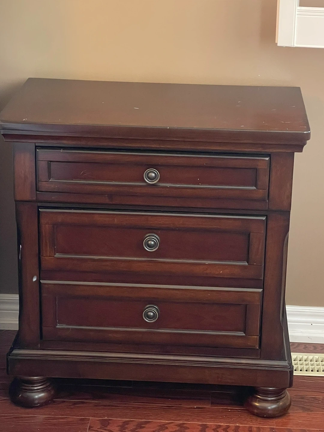 10Selling a Porter nightstand from Ashley Furniture. It's in good condition and features three drawers for storage. Two available Dimensions: - Height: 30" - Width: 28.75" - Depth: 18.25" - Weight: 82lbs This nightstand originally retailed for $729.99!