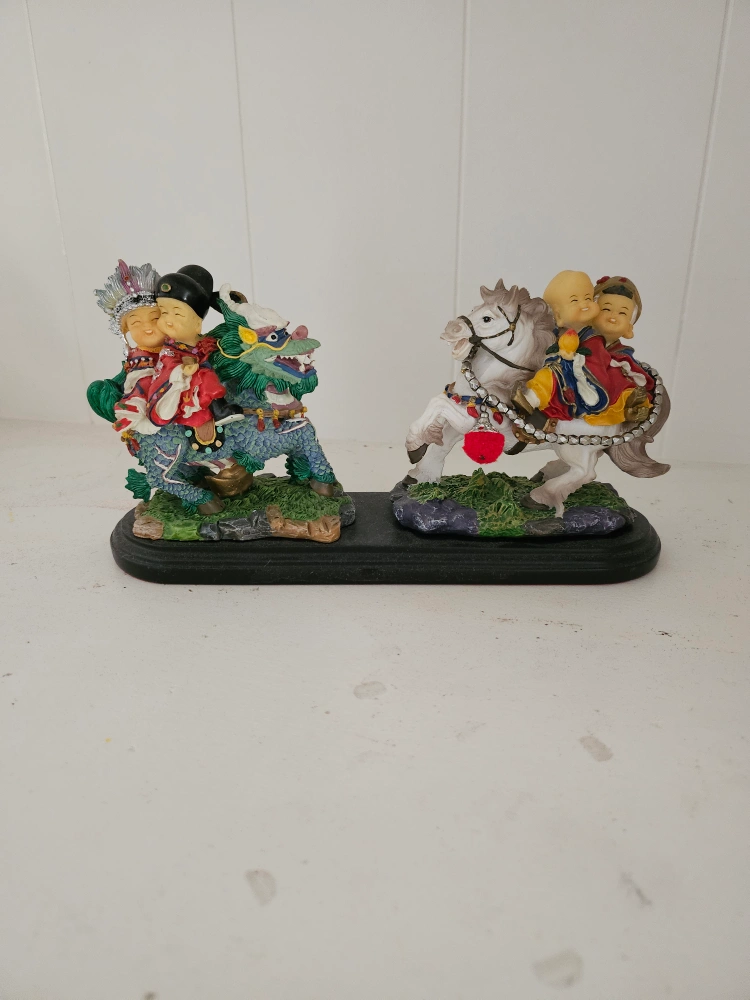 Selling a charming set of Asian figurines. This set features two distinct scenes with figures riding a dragon and a horse. These figurines would add a touch of cultural flair to any space!