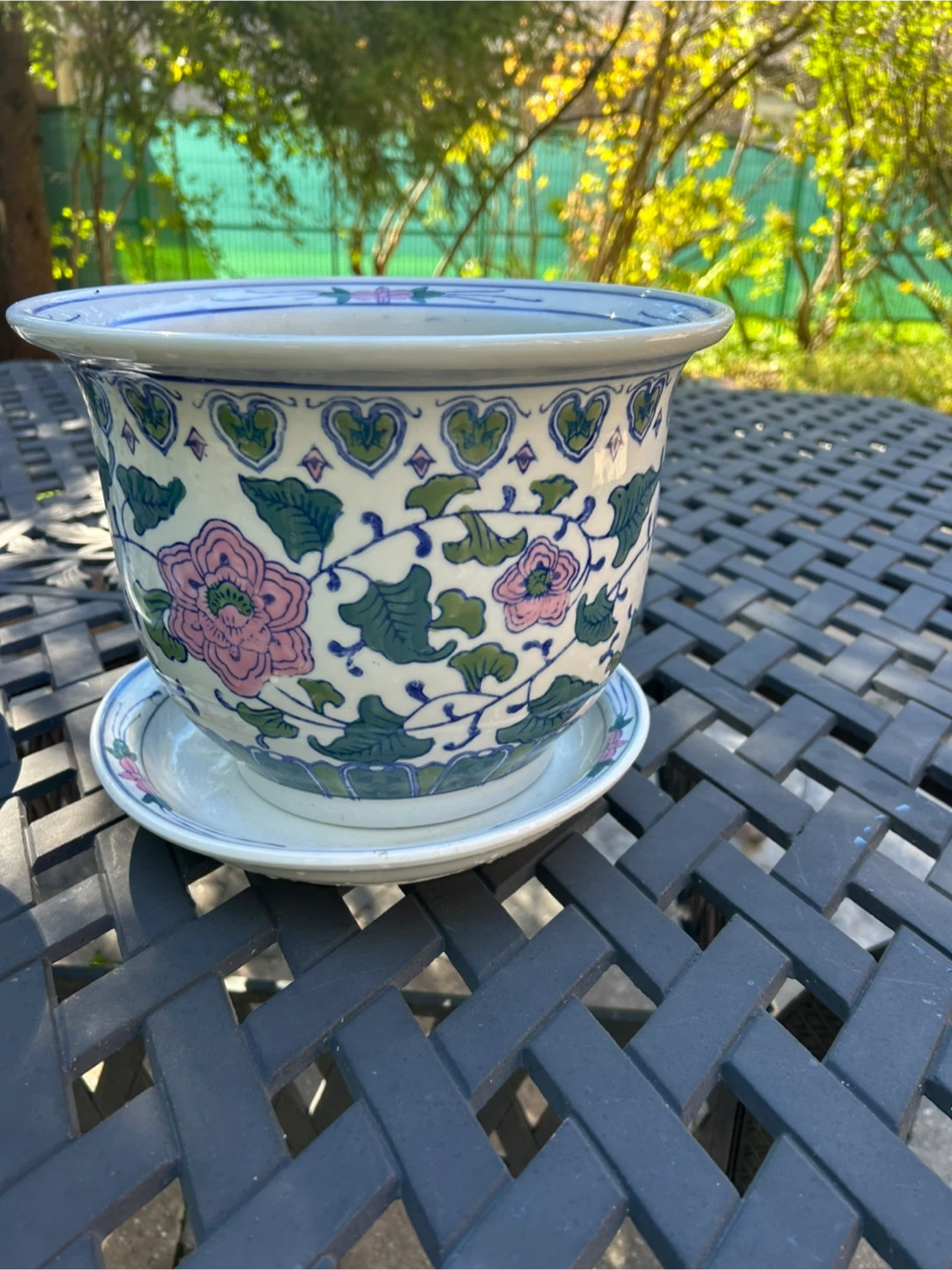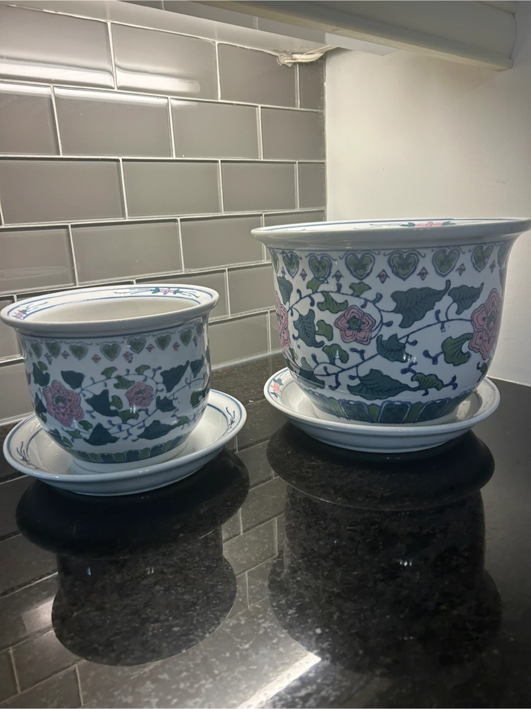 Selling a set of two lovely floral ceramic planters, each with its own saucer. They're in great shape and ready to add a touch of charm to your indoor or outdoor plants! Smaller size is 6” height and 8 inches wide asking $35 Larger size is 8 1/2 inches height 11 inches wide Asking $45