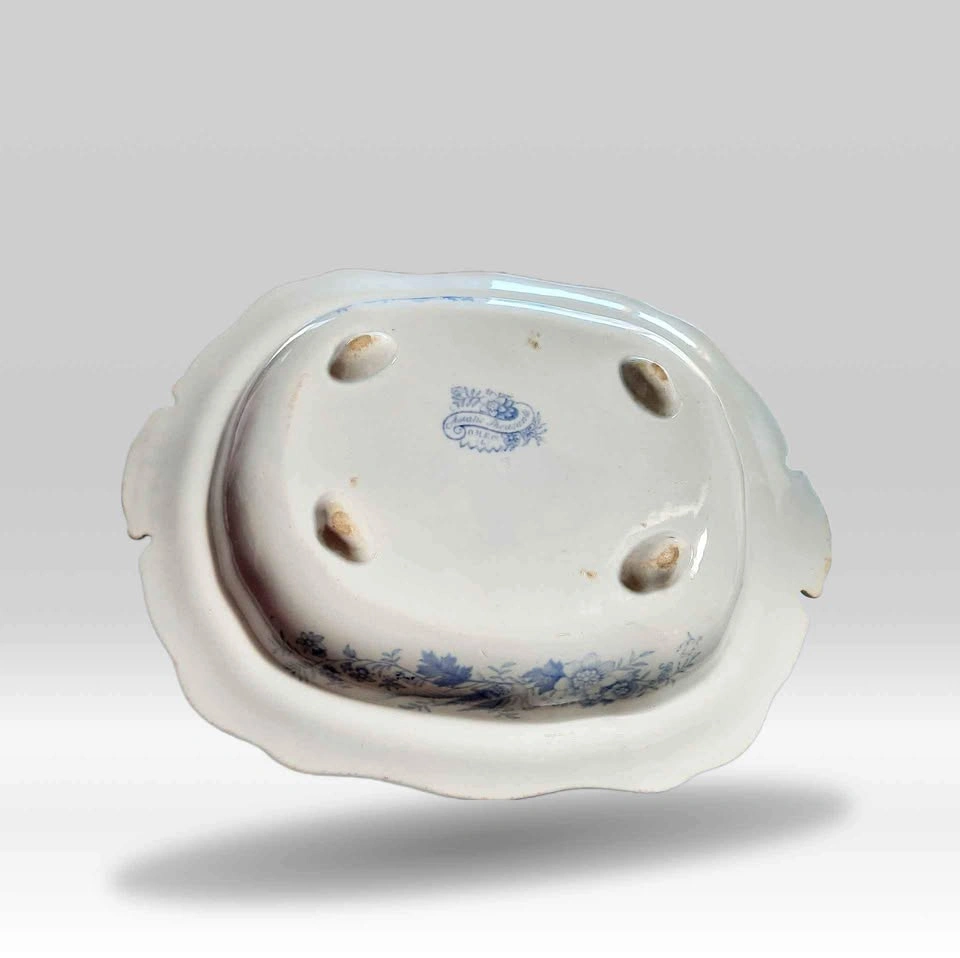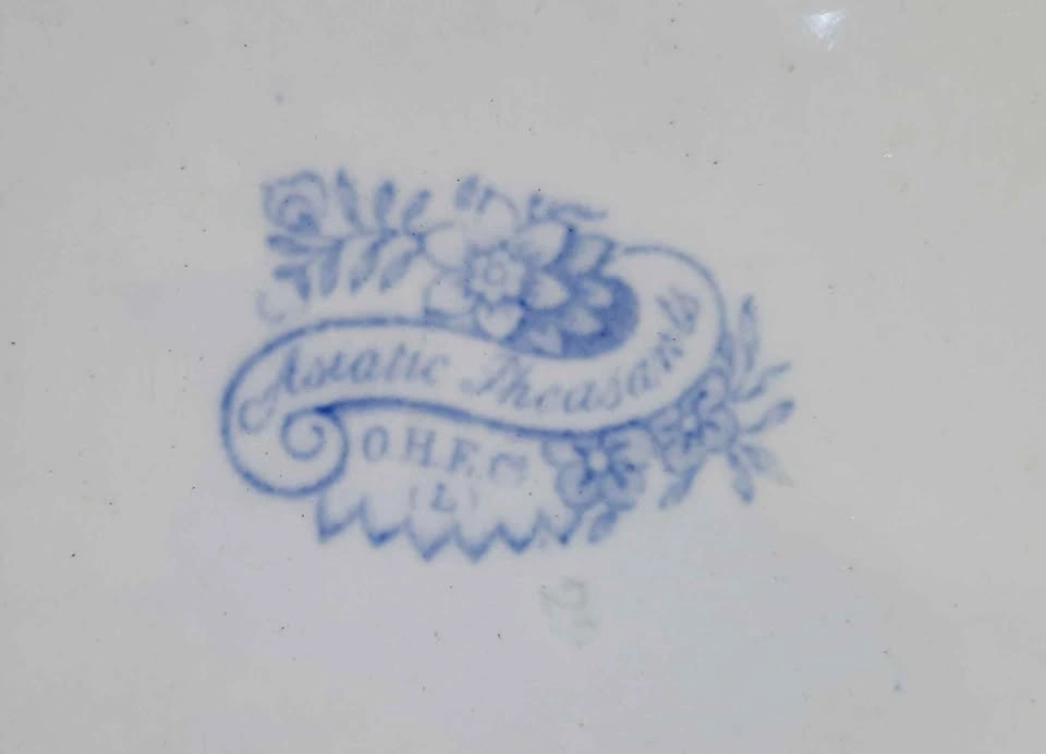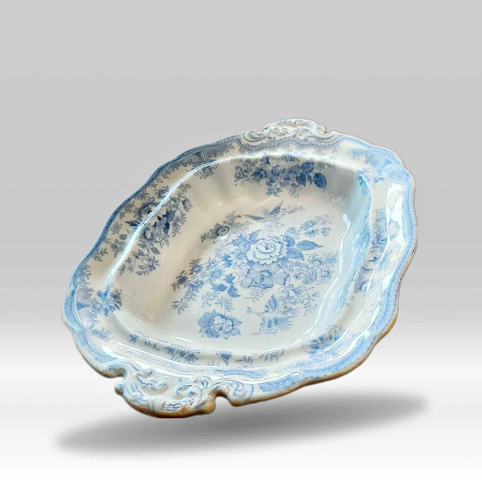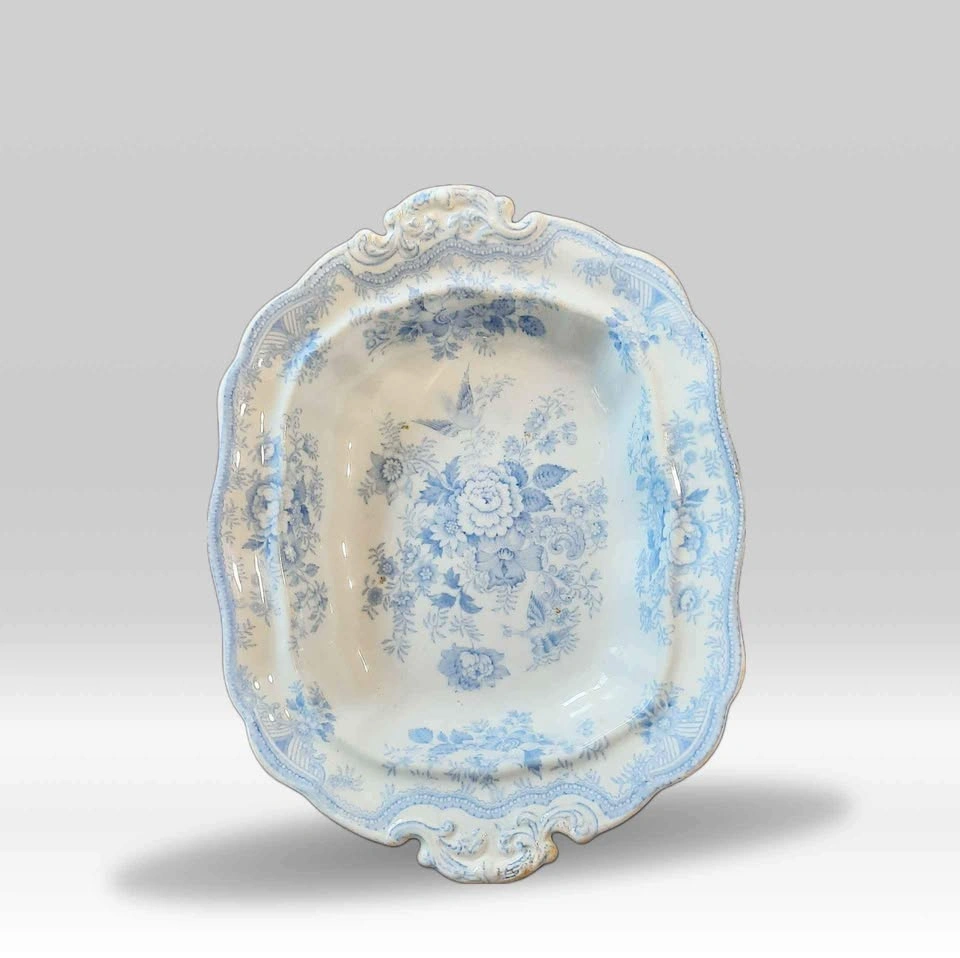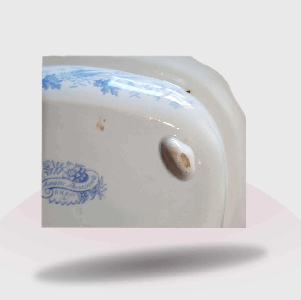 Asiatic Pheasants Footed Vegetable Bowl w/handles. This is a beautiful antique footed vegetable serving dish made in England in the 1800’s The back is marked “Asiatic Pheasant” 12” x 9” x 2.5” some discoloration and a tinta hole all as pictured