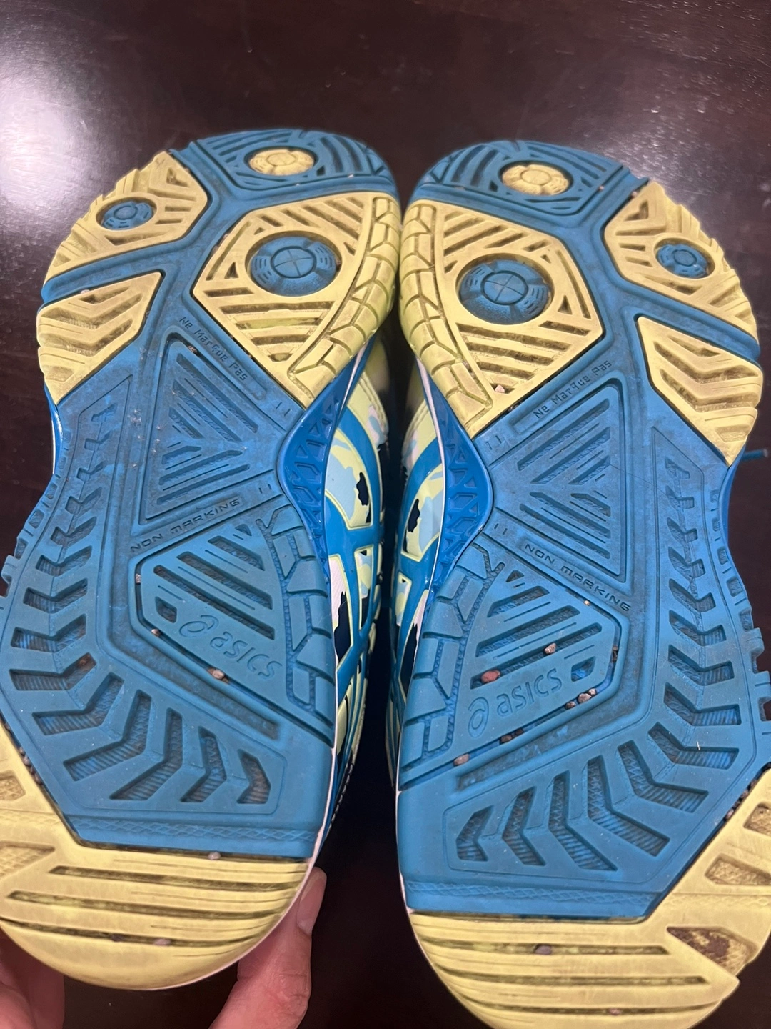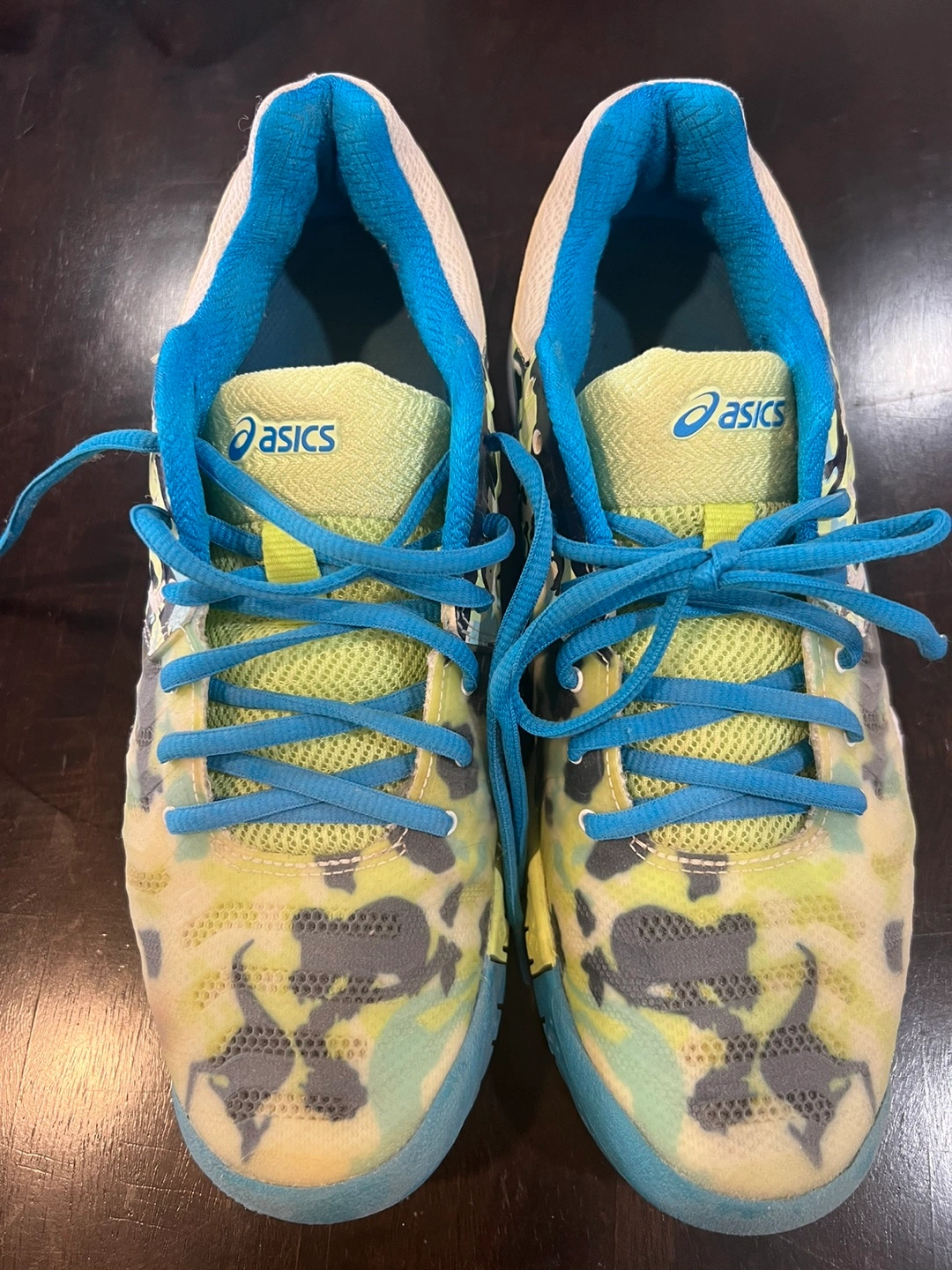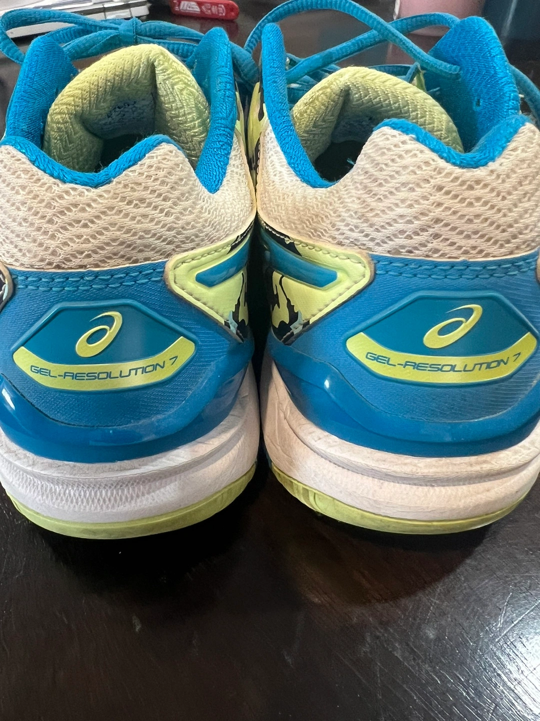 Selling a pair of Asics Gel-Resolution 7 tennis / pickleball shoes. They are a US size 9 and have a cool blue and yellow colour scheme. They're in good condition and ready for the court!