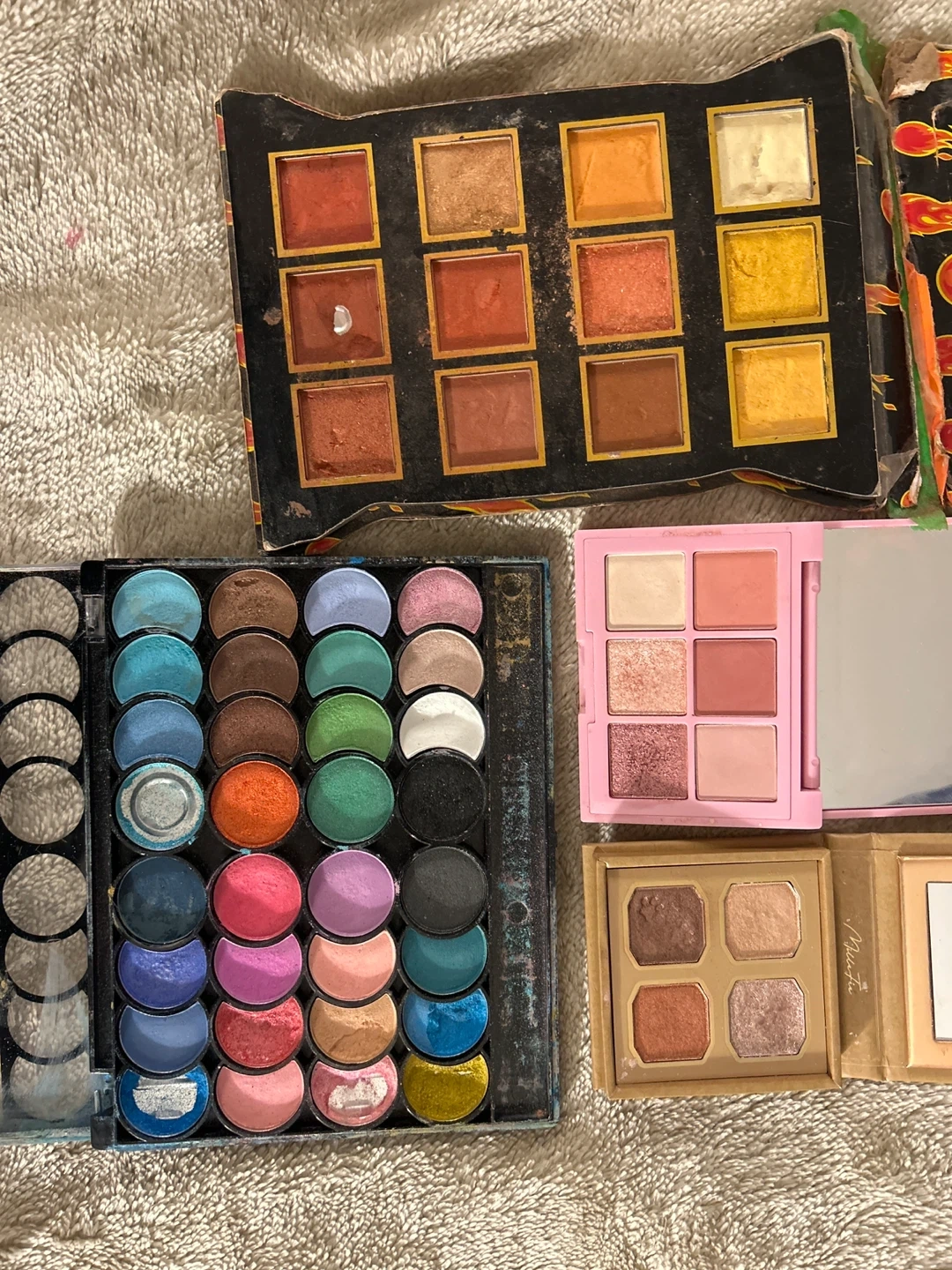 Collection of eyeshadow palettes with various colors. Includes a large palette with multiple shades, a smaller pink palette with 4 colors, and a brown-toned quad palette. All palettes contain pressed powder eyeshadows.