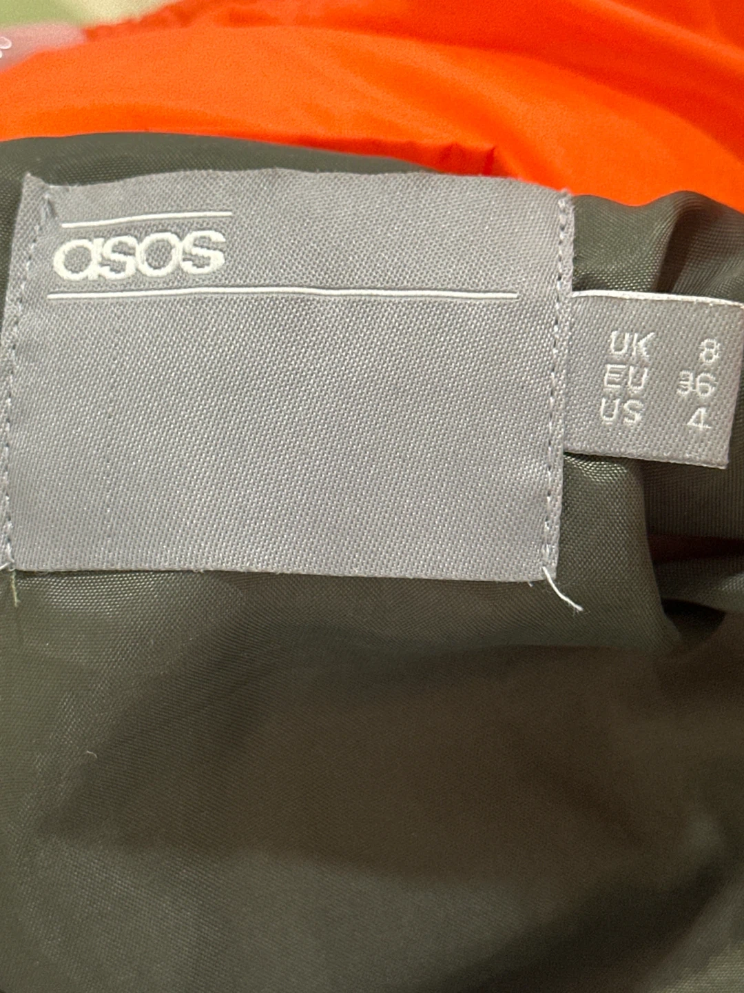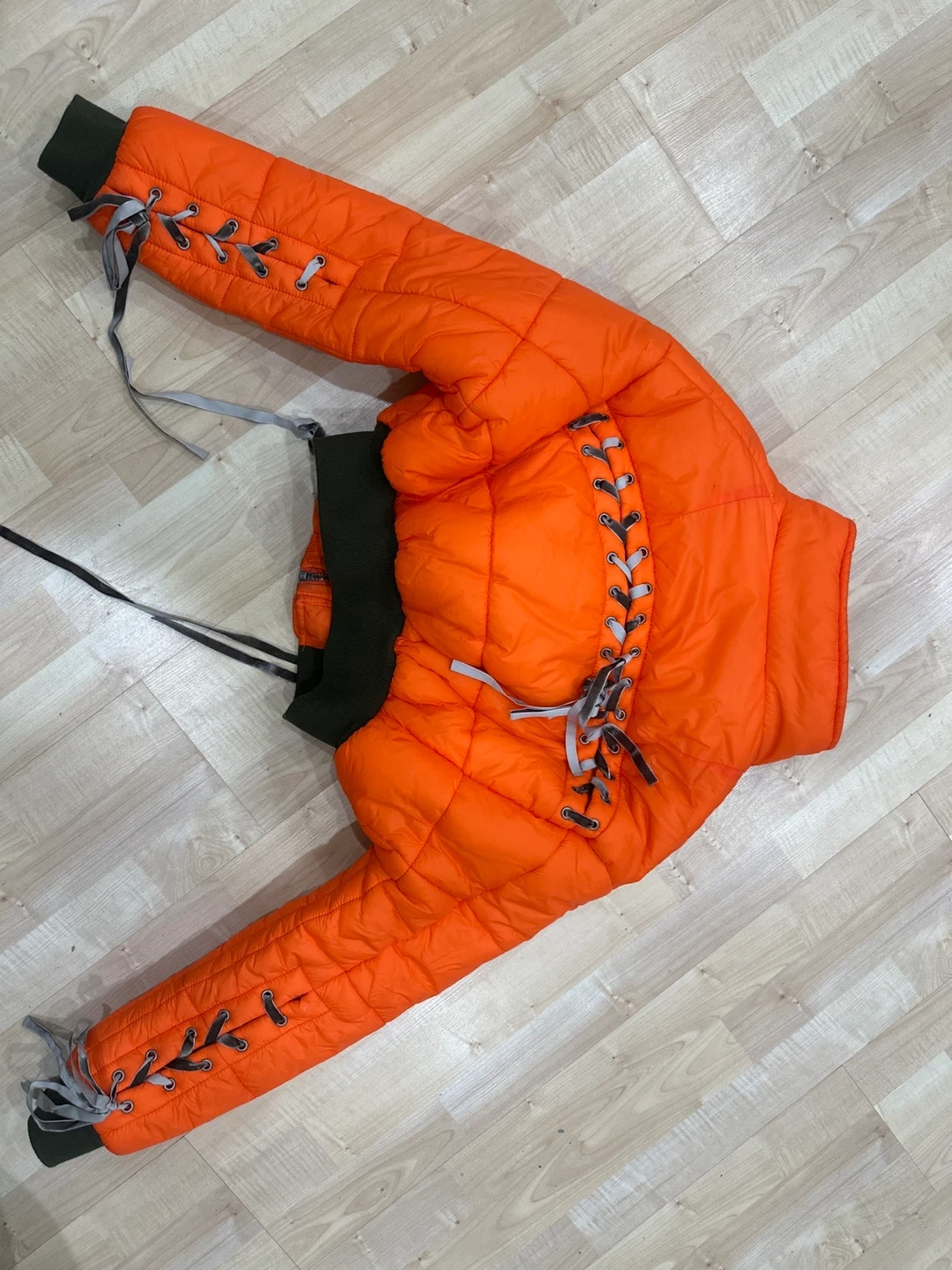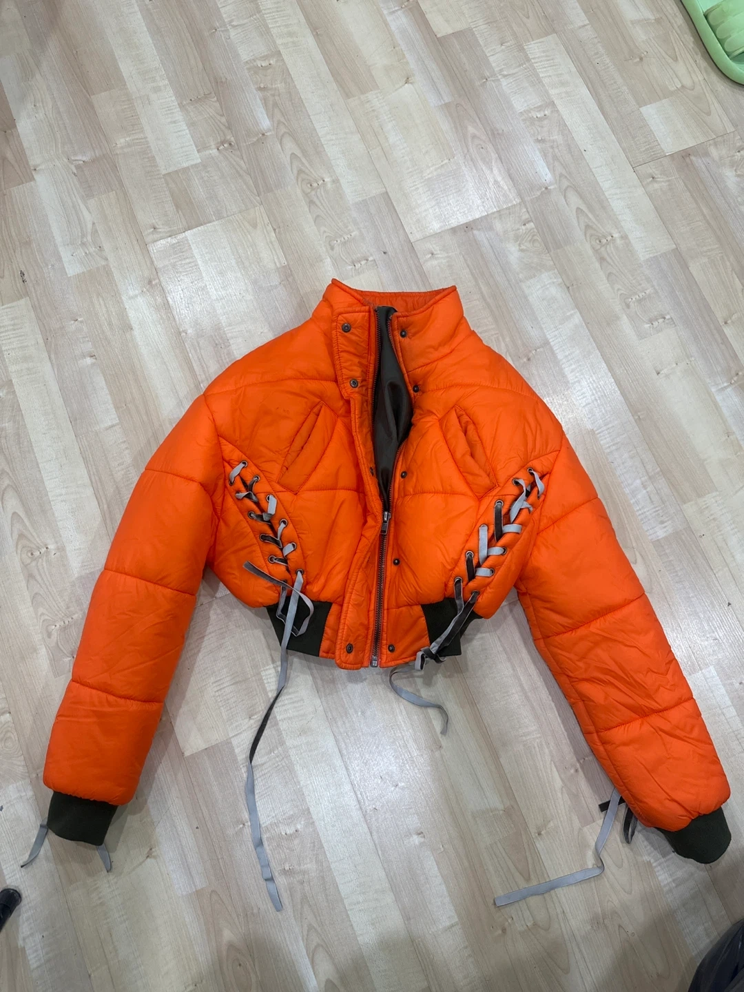 10Selling a vibrant orange puffer jacket from ASOS! It's a size US 4 and in great condition. Perfect for adding a pop of colour to your wardrobe. It has a unique design with lace-up detailing on the sides