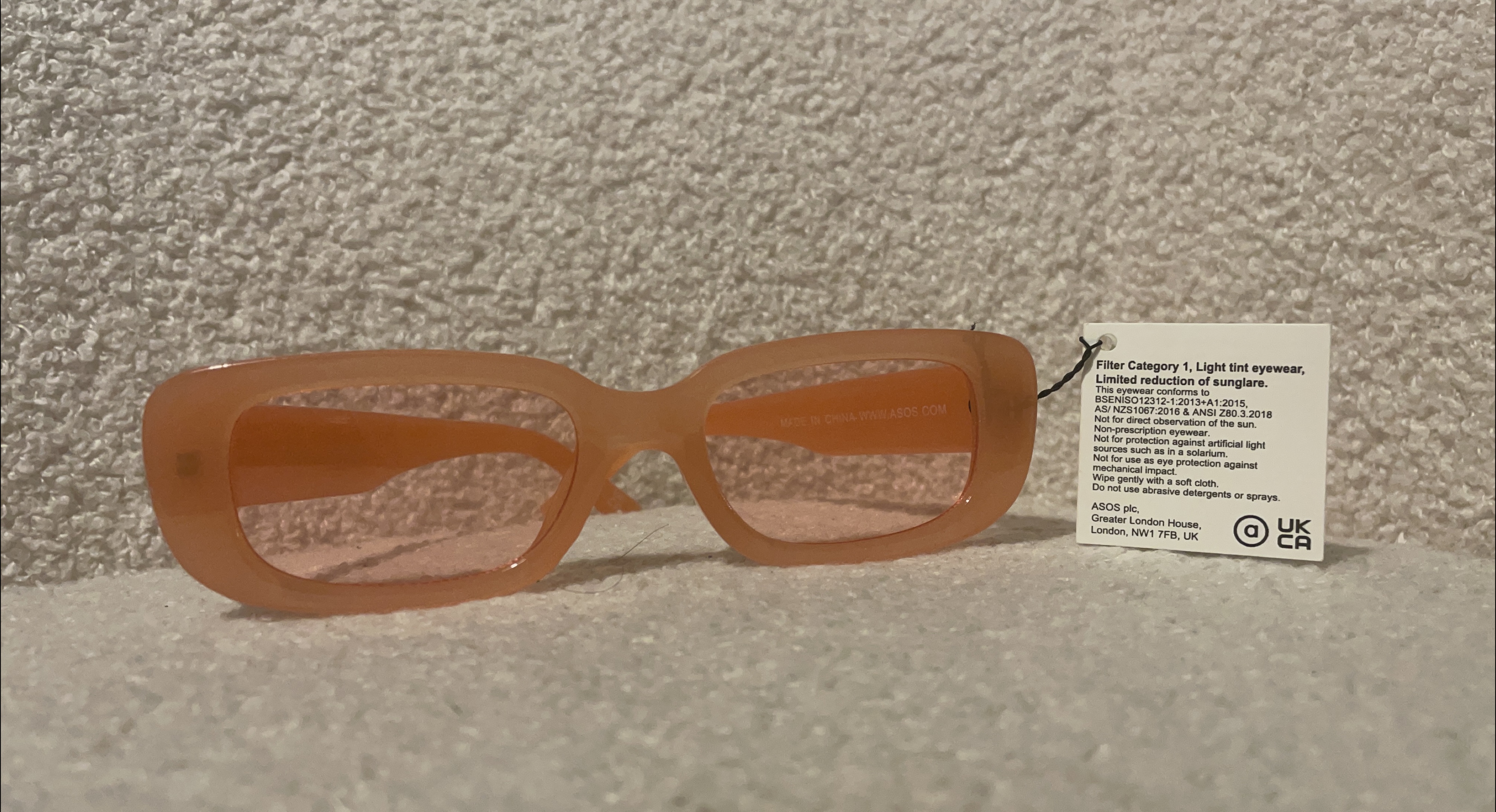 Peach tinted sunglasses from ASOS! These sunglasses are non-prescription eyewear and provide limited reduction of sunglare. They are made in China and should be wiped gently with a soft cloth. Avoid using abrasive detergents or sprays