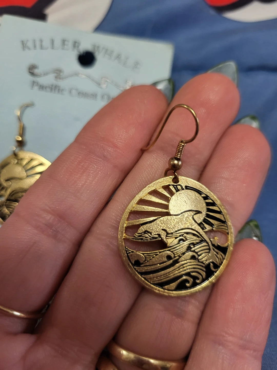 These dangle earrings feature a killer whale design with a sun and waves motif. They're made in B.C. and come on their original card. Great for anyone who loves marine wildlife!