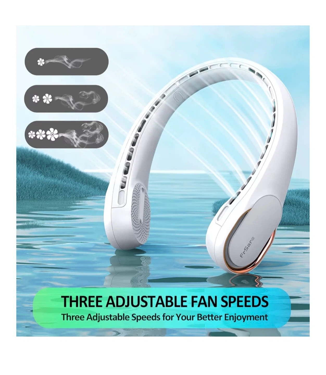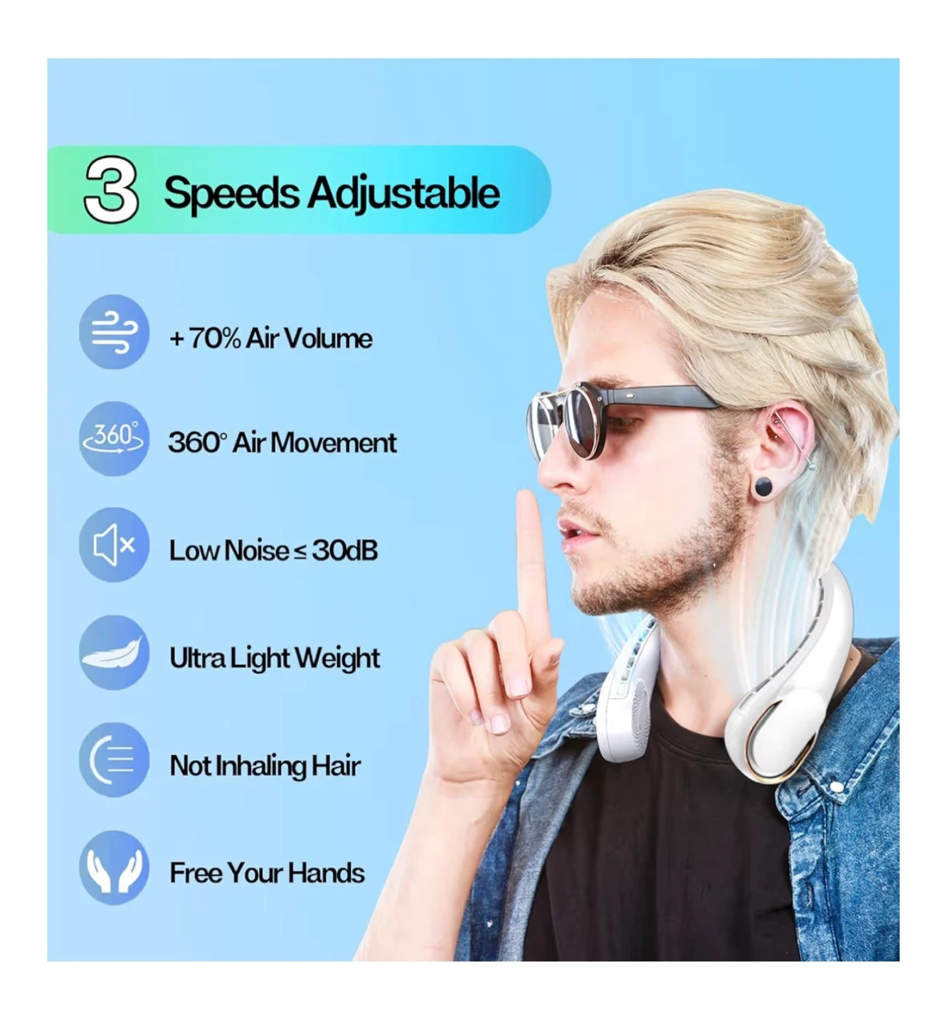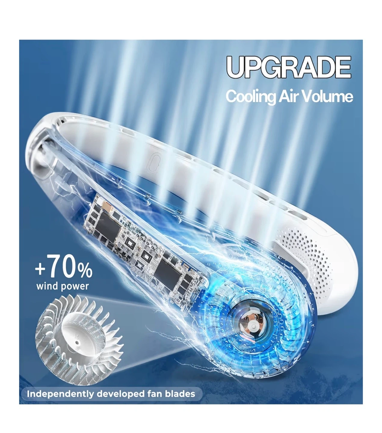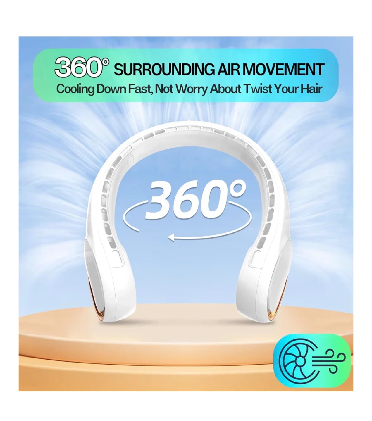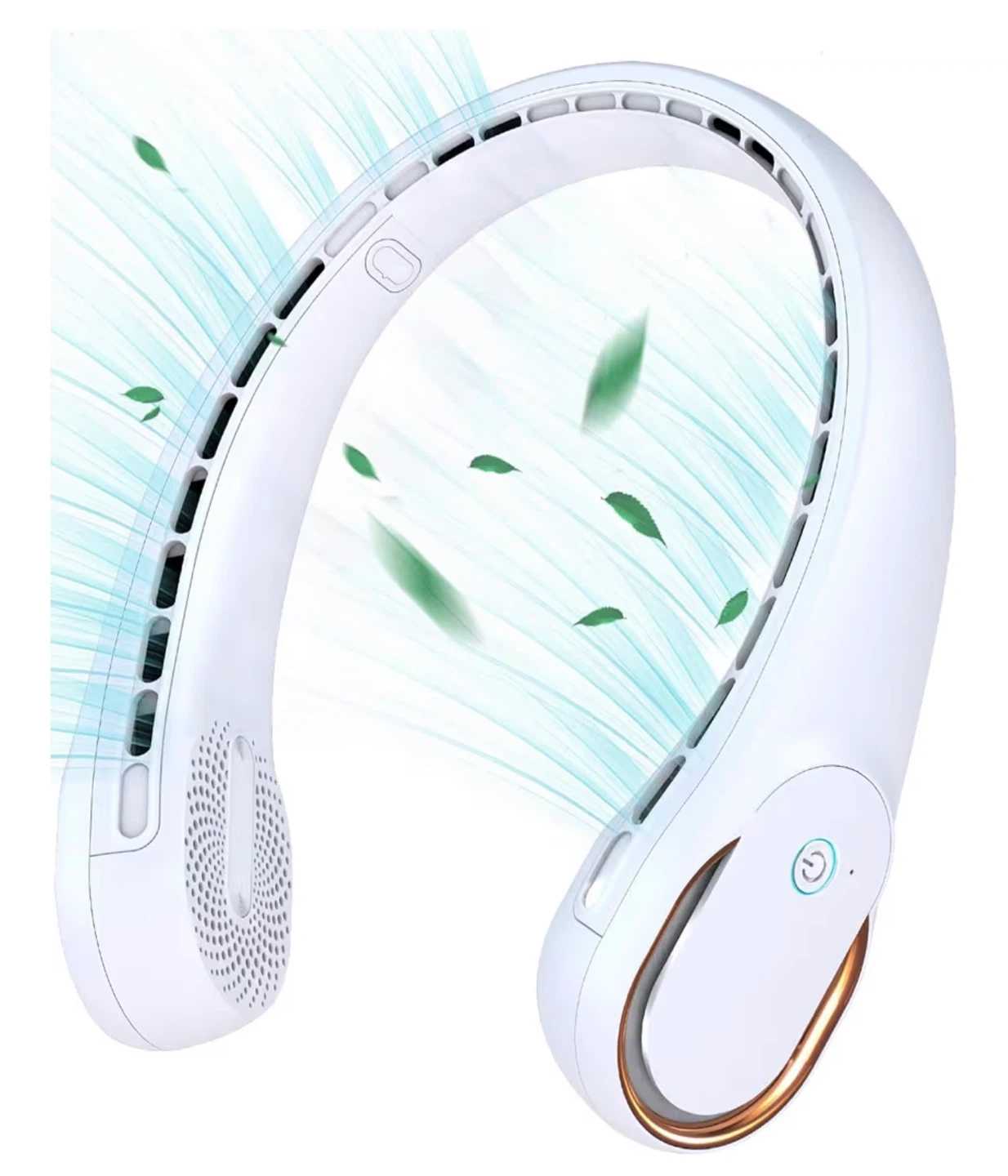 This bladeless neck fan is lightweight and portable. It offers ultra-quiet operation and 360-degree air movement for quick cooling. It has a large 4000 mAh capacity battery for 4-16 hours of use.