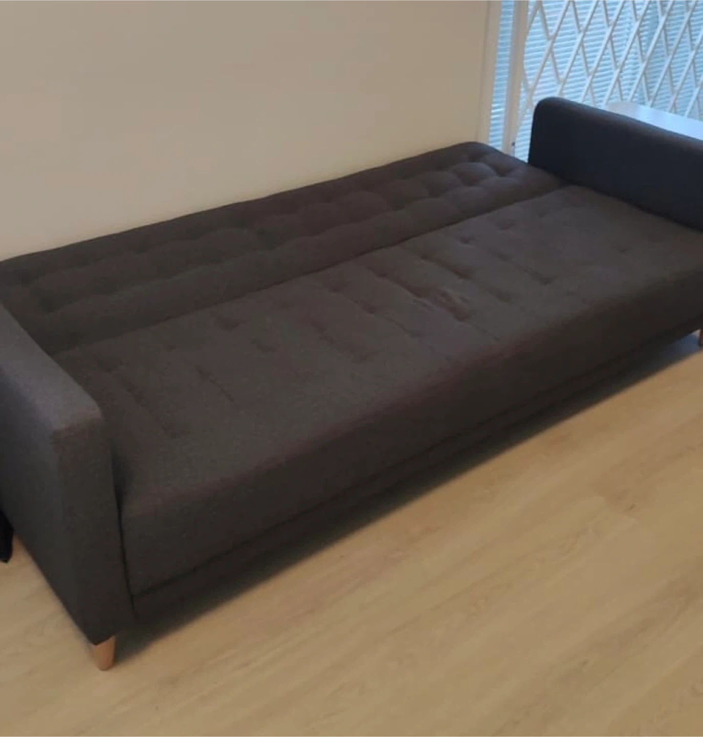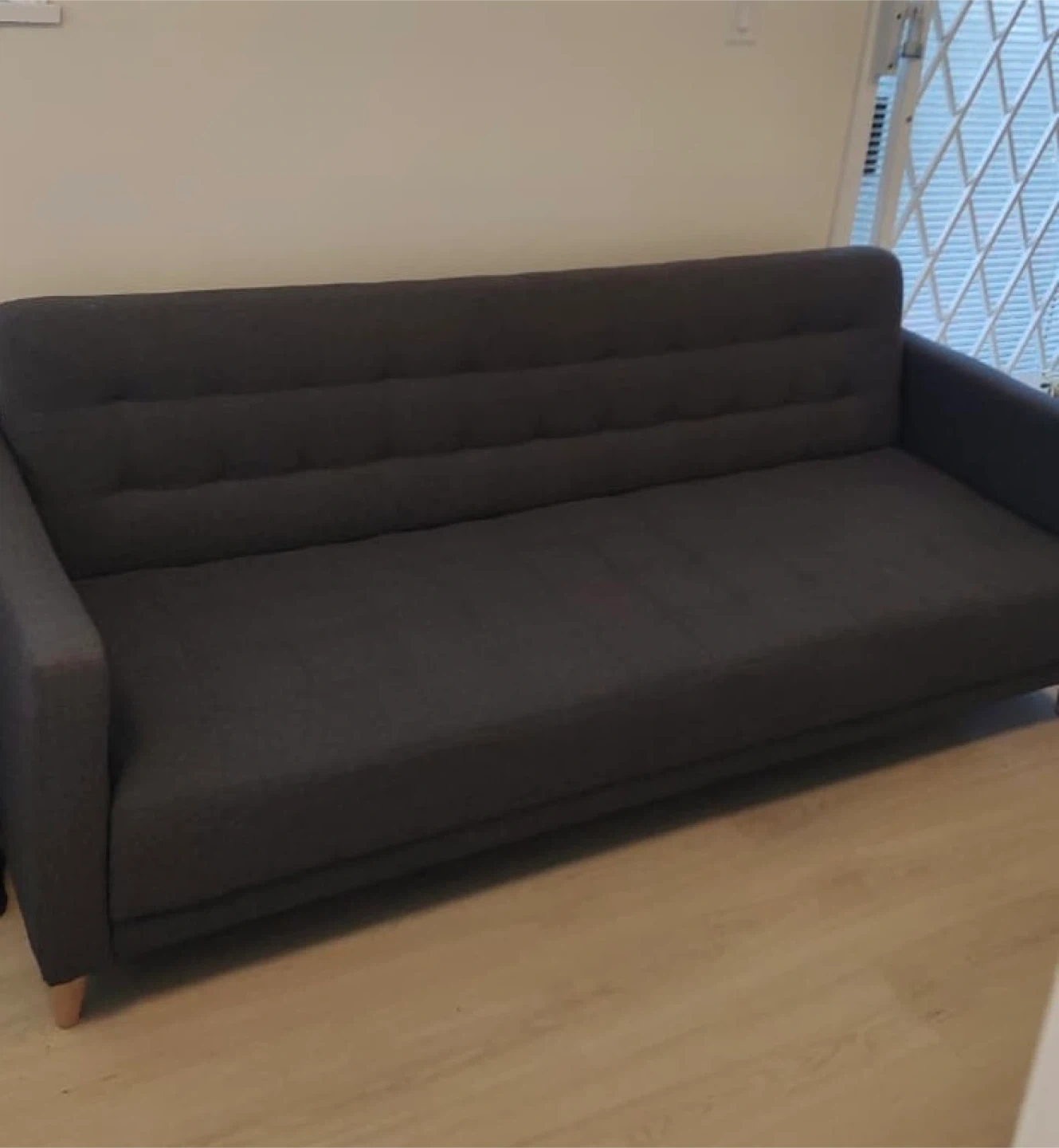 This is a dark grey sofa bed. It's upholstered in a durable fabric. The tufted back design adds a touch of style. It converts easily into a bed for guests.