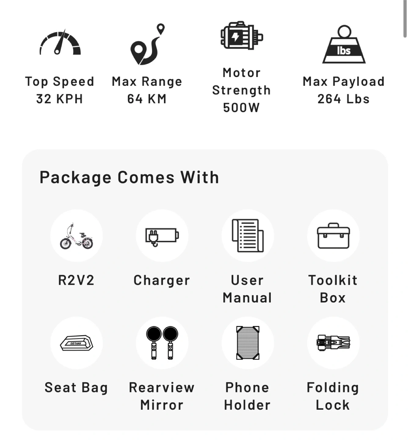 88Used since Oct 10, 2025. Max Speed: 32KPH 64KM Range 500W Motor Max Payload: 264 lbs (119.75 kg) Comes with Seat Bag, Phone Holder, Folding Lock, Rearview Mirrors, & Toolbox Bag. Comes with foldable rear basket (net included). Features: Foldable (3 Folds) Passcode Lock Ignition Key (2 keys) Speed Limit Removable Battery Vertically Adjustable Seat No Companion App No Apple Find My If you buy the new one from GoTrax online, you'll have to assemble the ebike yourself. Open to Trades for Equivalent SEGWAY-Ninebot Electric Kick Scooters. (Less than 3 months of usage)